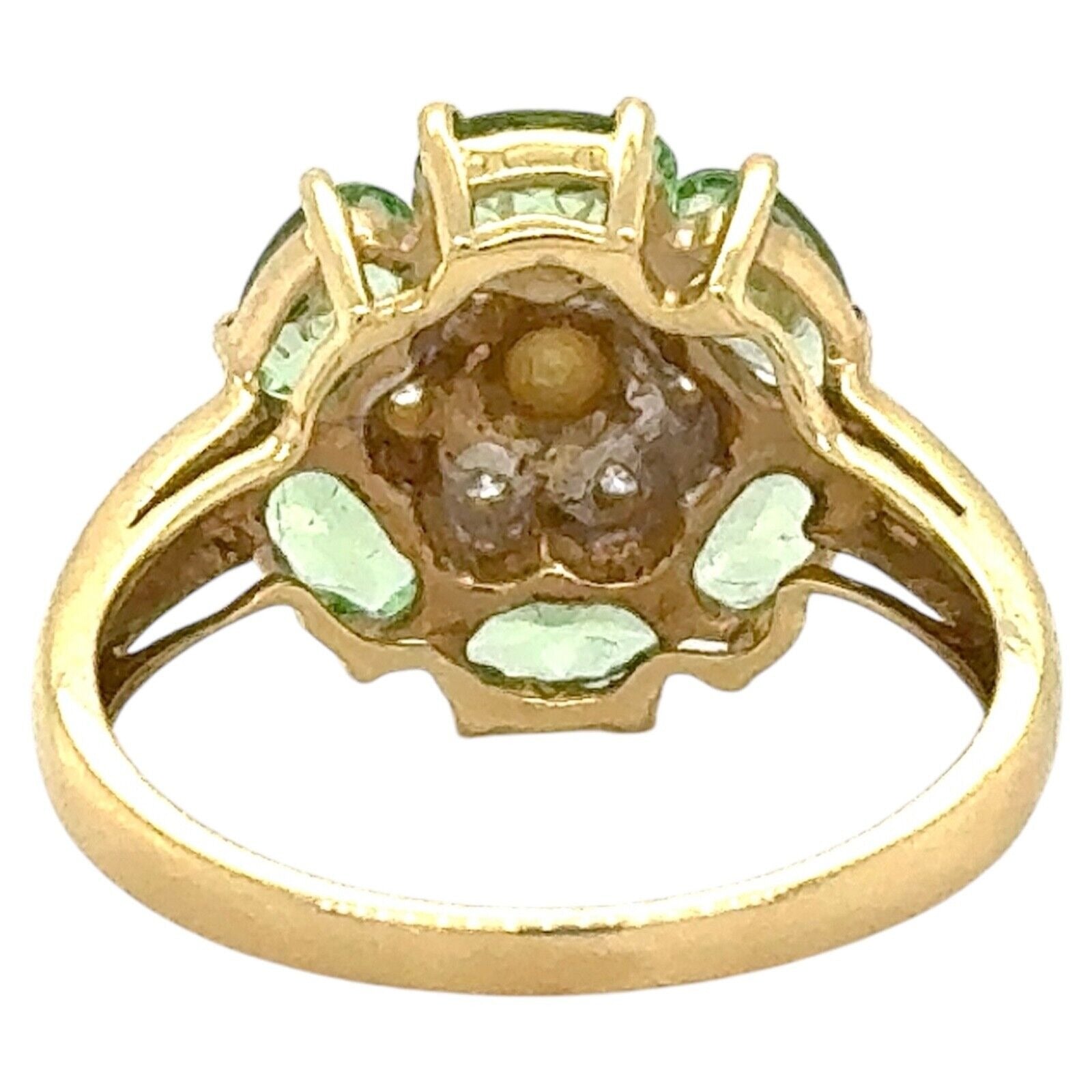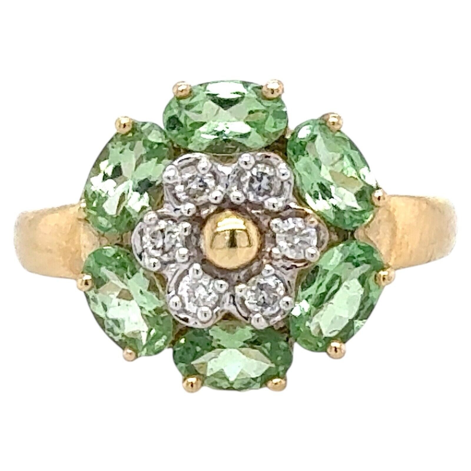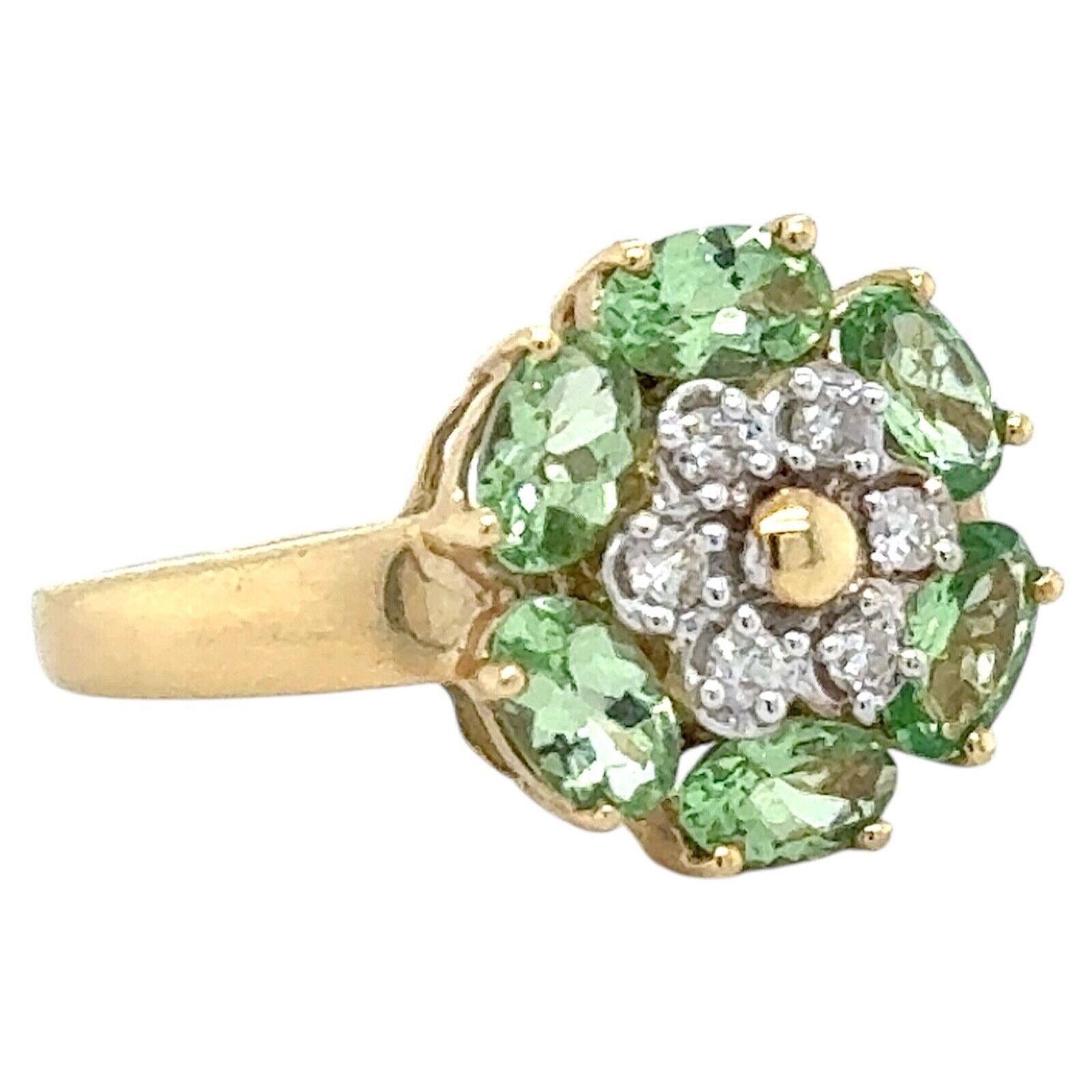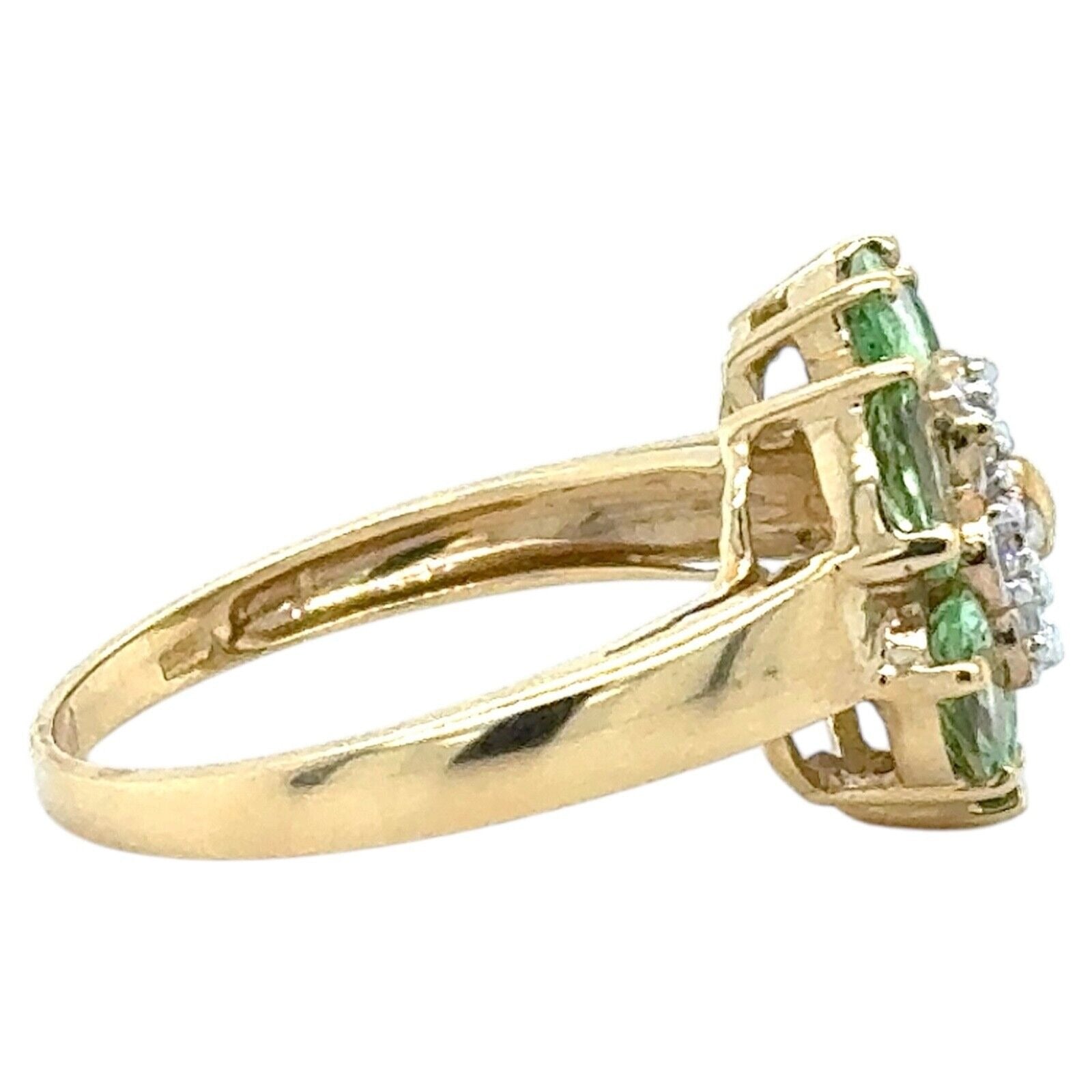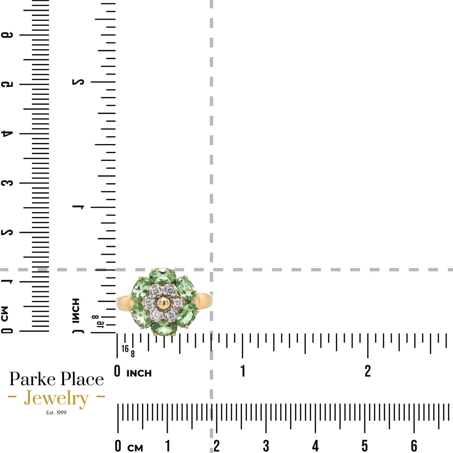 This 1.3ctw Tsavorite Garnet & Diamond 14k Yellow Gold Ring is a stunning piece of fine jewelry. The ring features a flower shape design with a cluster of diamonds and tsavorite garnet stones, making it a beautiful and unique gift. Made with 14k yellow gold, this ring exudes elegance and sophistication.