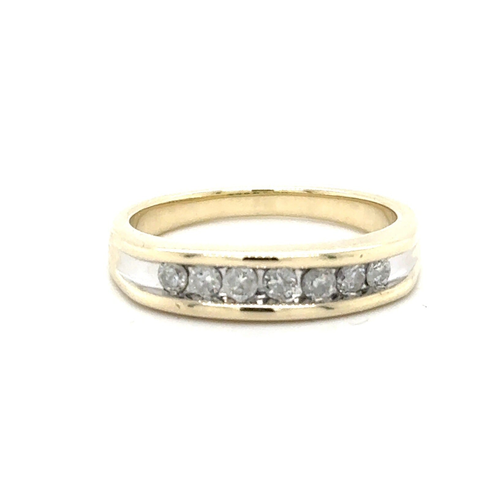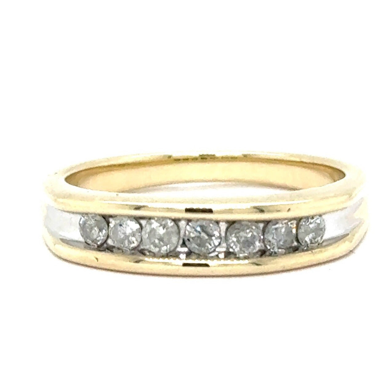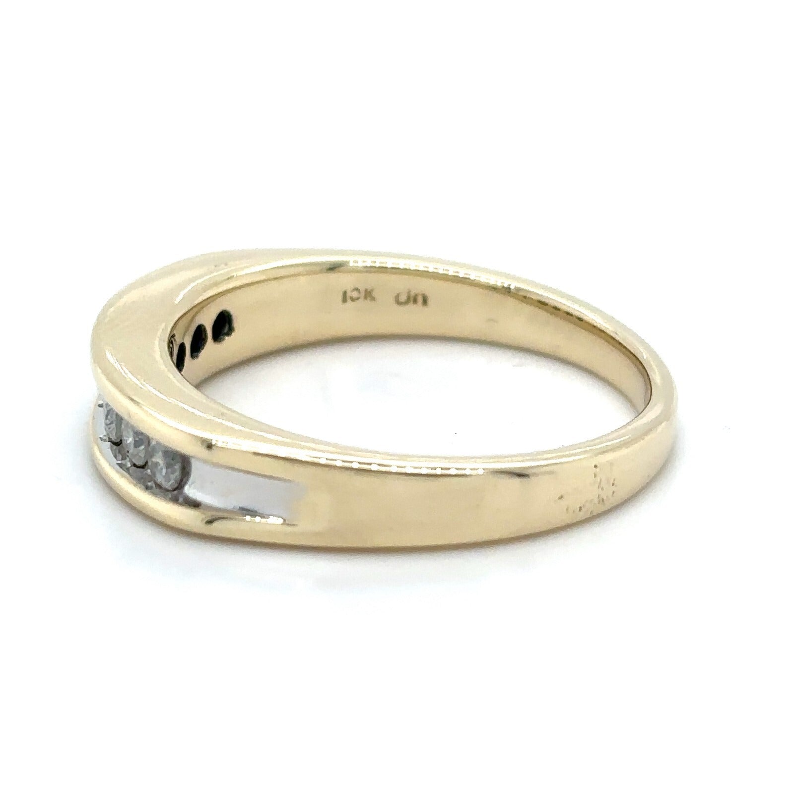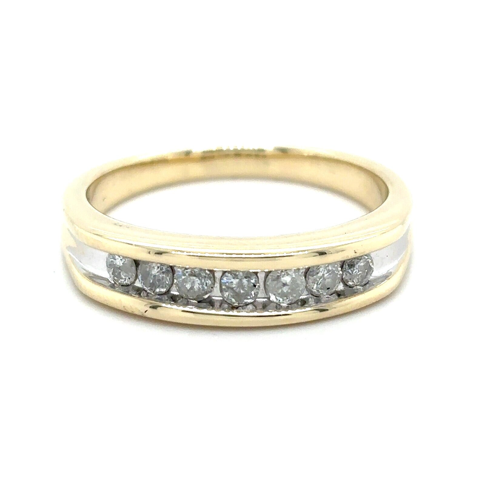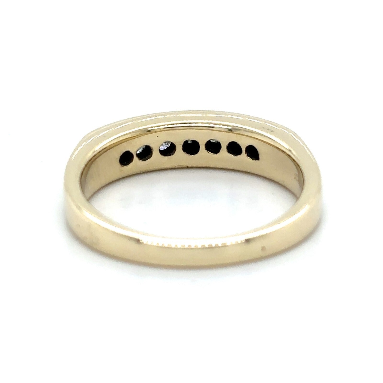 This 1/4 diamond band ring is made of real solid 10k yellow gold and weighs 6.3g. The ring is size 10.5, and it features 7 round diamonds with a total carat weight of .25. The diamonds are channel-set, and the main stone width is 2.1mm. The ring's style is perfect for weddings and anniversaries, and it can be personalized if desired. The band width is 5mm, and the ring is resizable.
