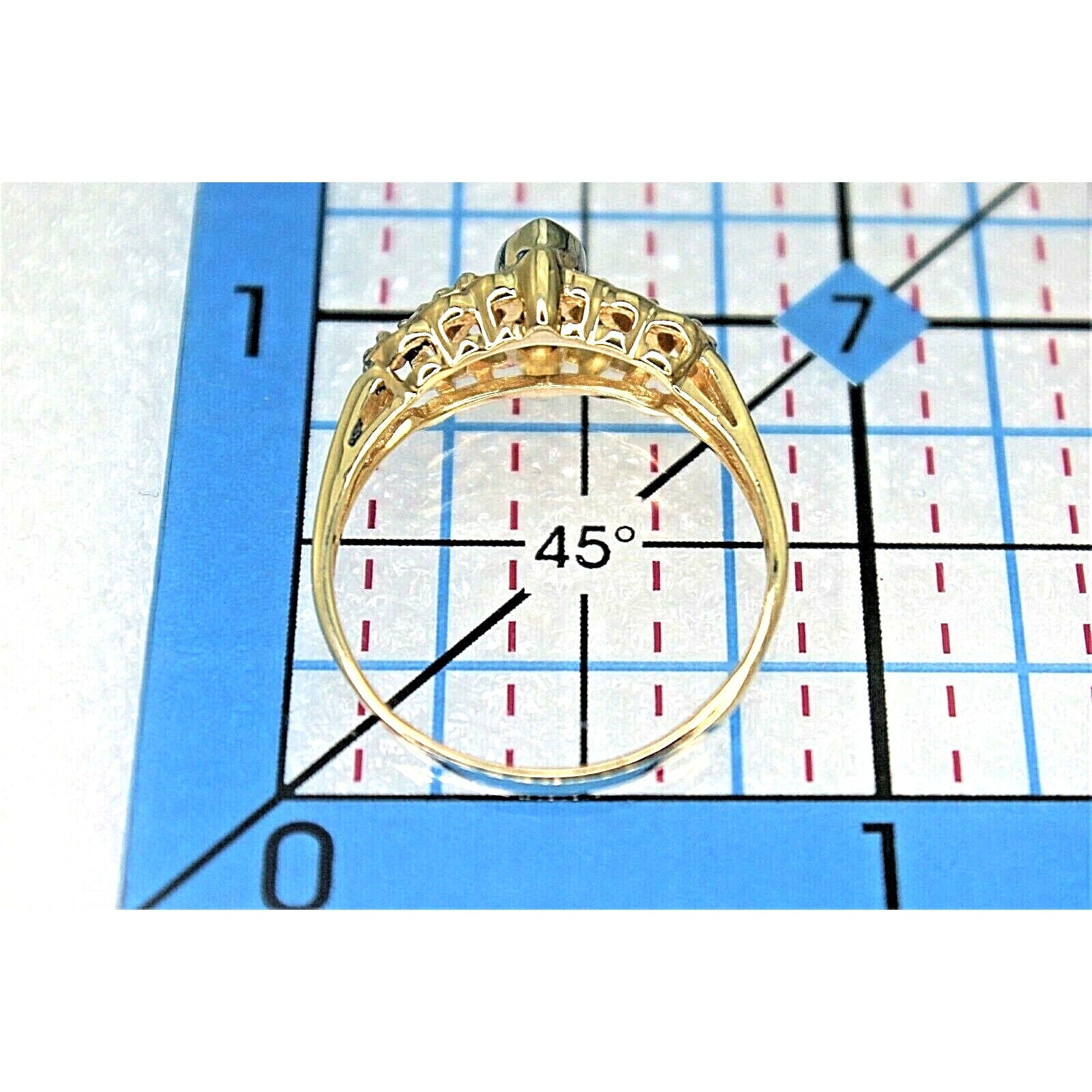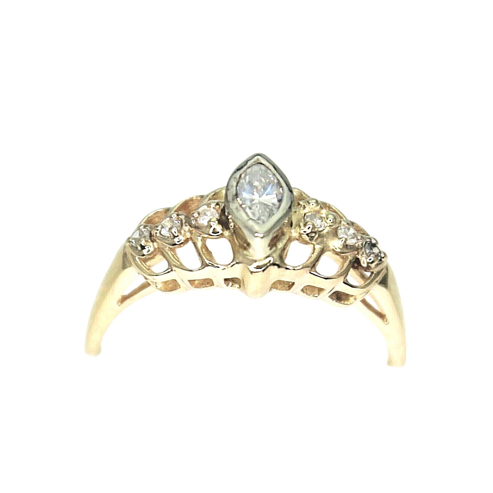 This stunning engagement ring features a 1/4ct diamond in a classic solitaire setting with beautiful accent rings. Crafted from high-quality 14k yellow gold, this ring is a true statement piece. The marquise-shaped diamond has a slightly included clarity grade (SI2) and a diamond color grade of H. The ring is available in size 8.5 and can be resized if needed.