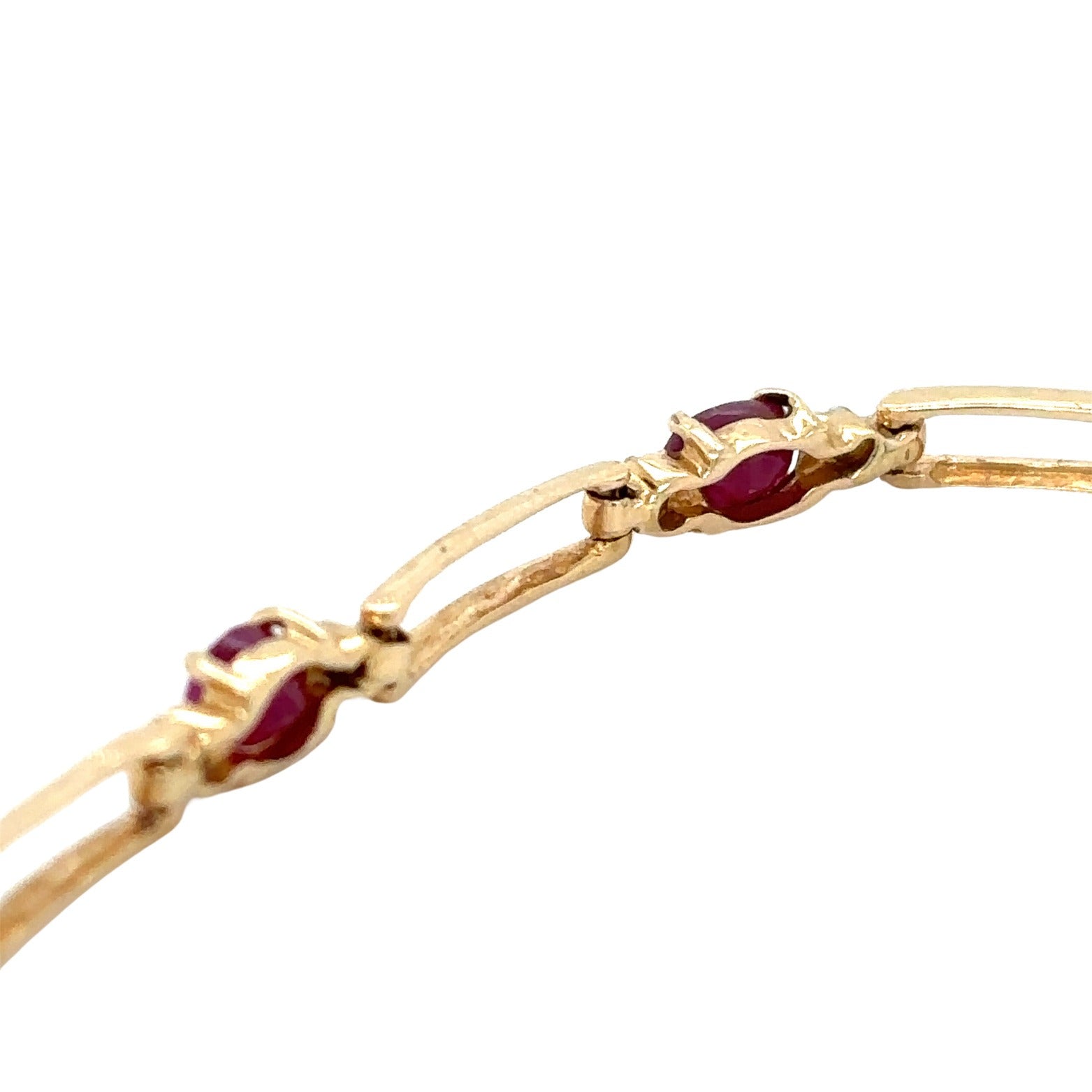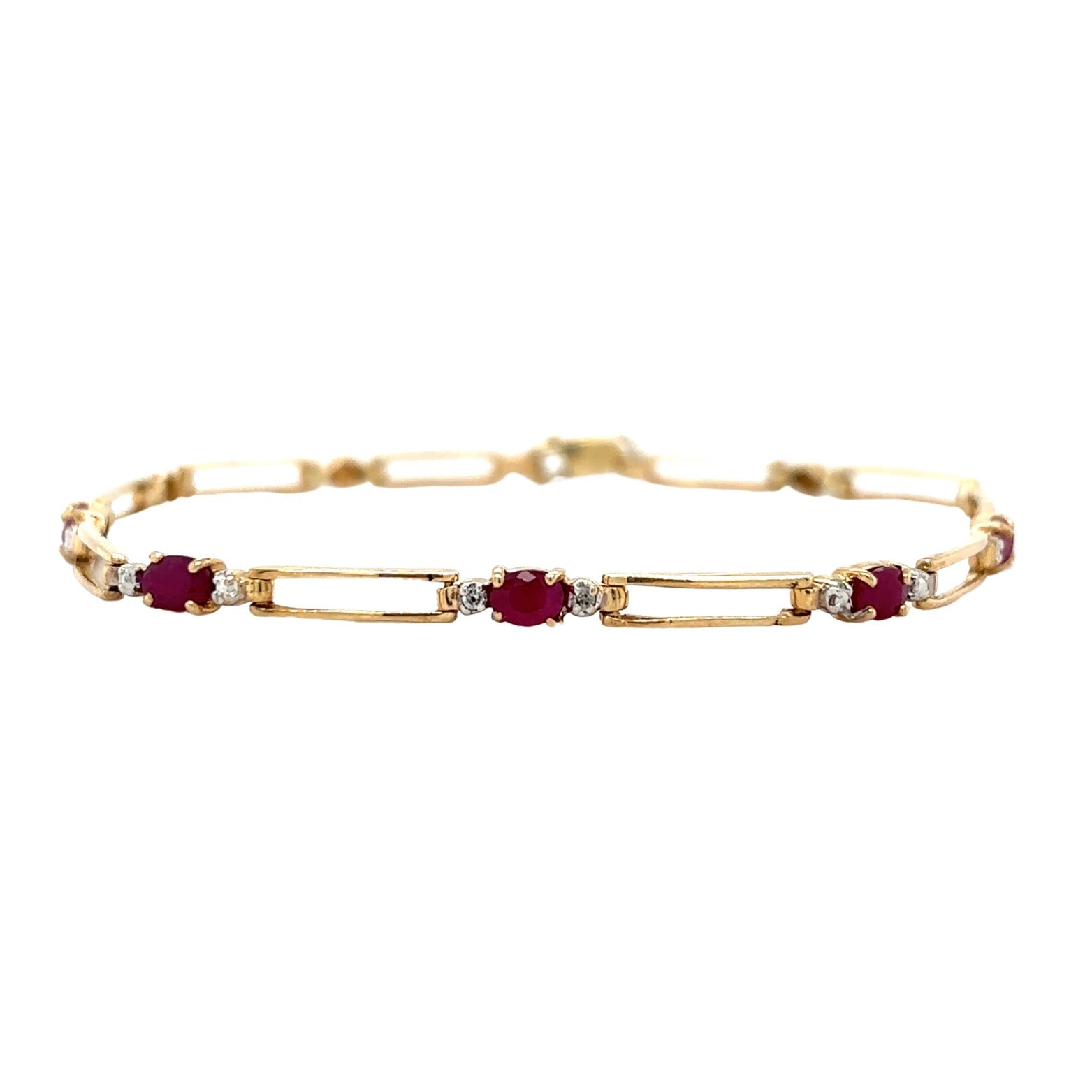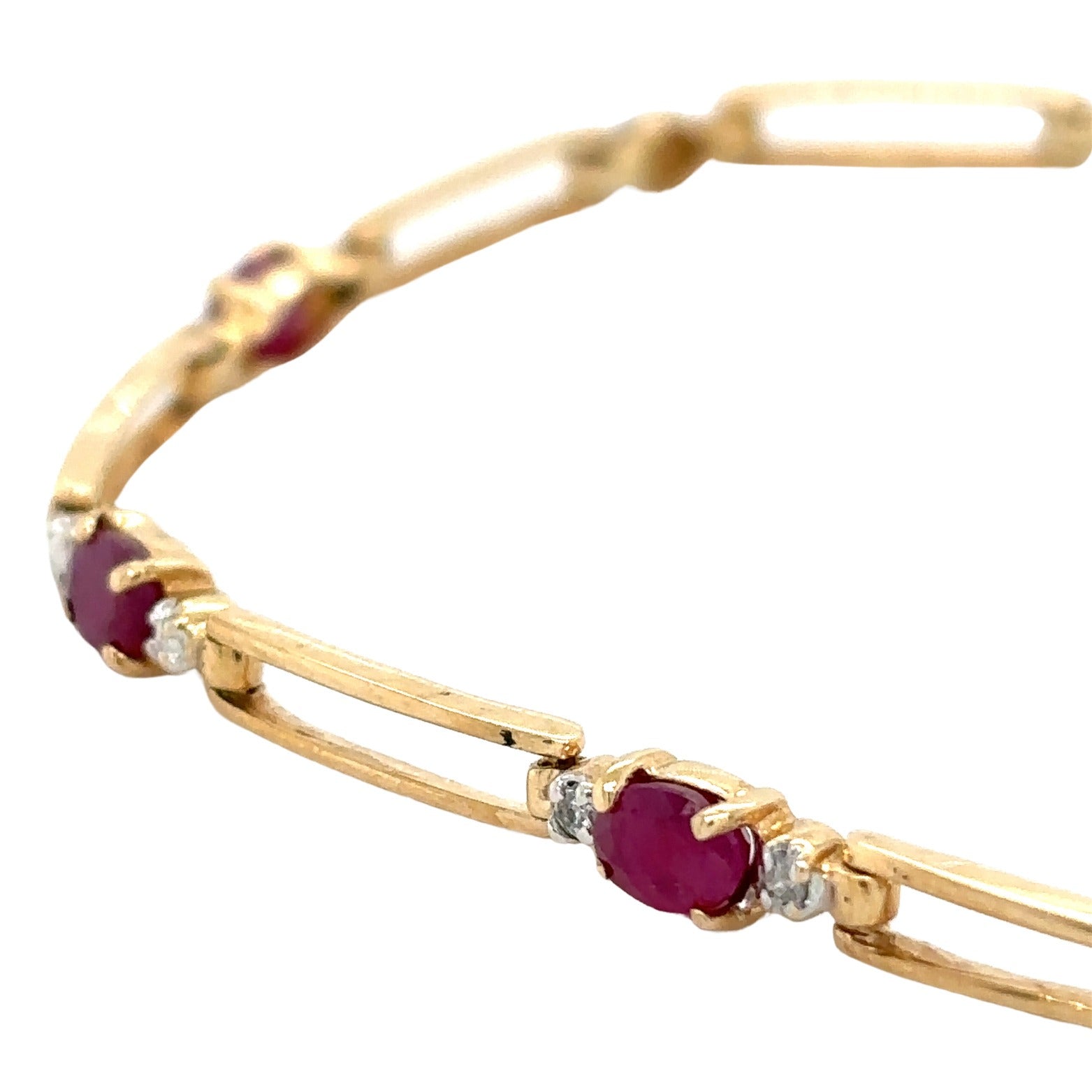 This stunning bracelet is made of 10k yellow gold and features a beautiful 1.25ctw set of oval ruby stones with 2 diamond accents. The lobster closure ensures a secure fit. The bracelet is 7 inches long and weighs 3.9g, making it a comfortable and durable accessory. This piece also comes with a seller warranty for added peace of mind when purchasing, and to ensure the bracelet's quality. This bracelet is a true beauty and will make a perfect addition to any jewelry collection.