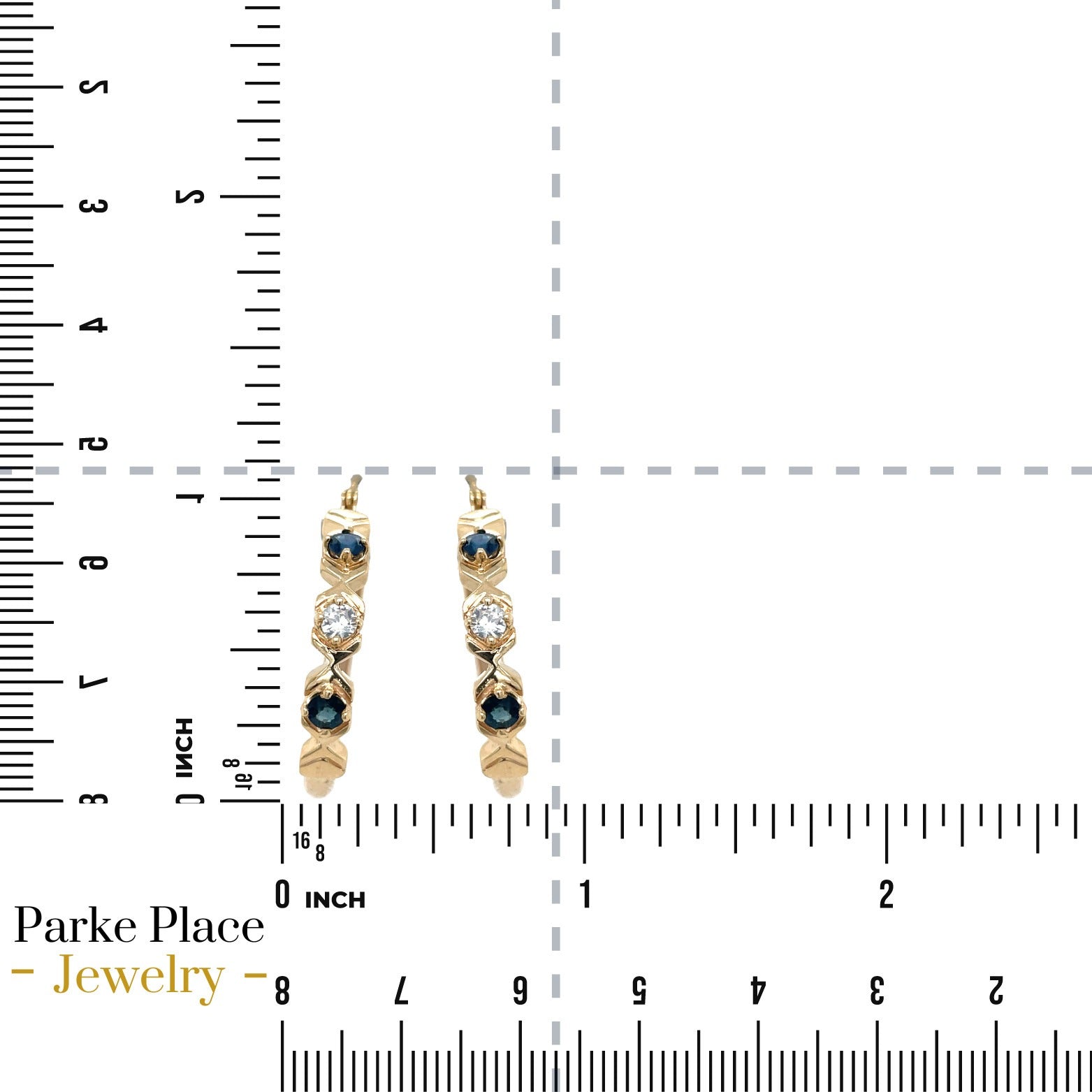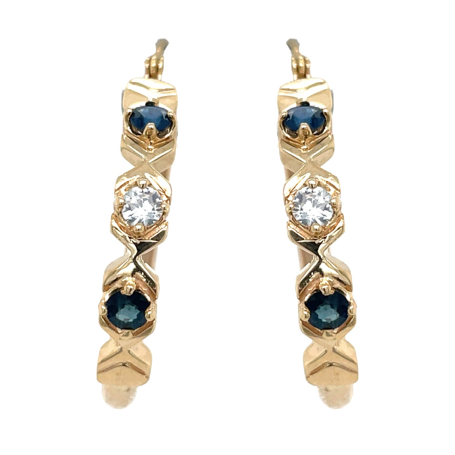 These 10K yellow gold hoop earrings are elegantly adorned with blue and white sapphires, offering a sophisticated and timeless appeal. The intricate design and high-quality gemstones make them an excellent choice for those who appreciate fine jewelry. Their weight ensures a comfortable fit for extended wear.