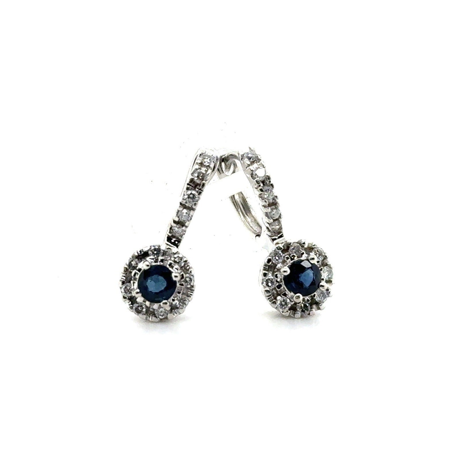 • 14k White Gold Construction • Dangle Style with Leverback Closure • Gemstone Carat Weight: 0.25 Total • 26 Accent Diamonds • Blue Sapphire Gemstones.
