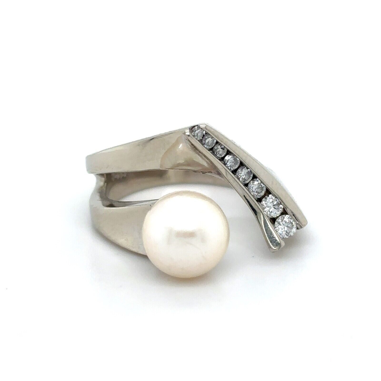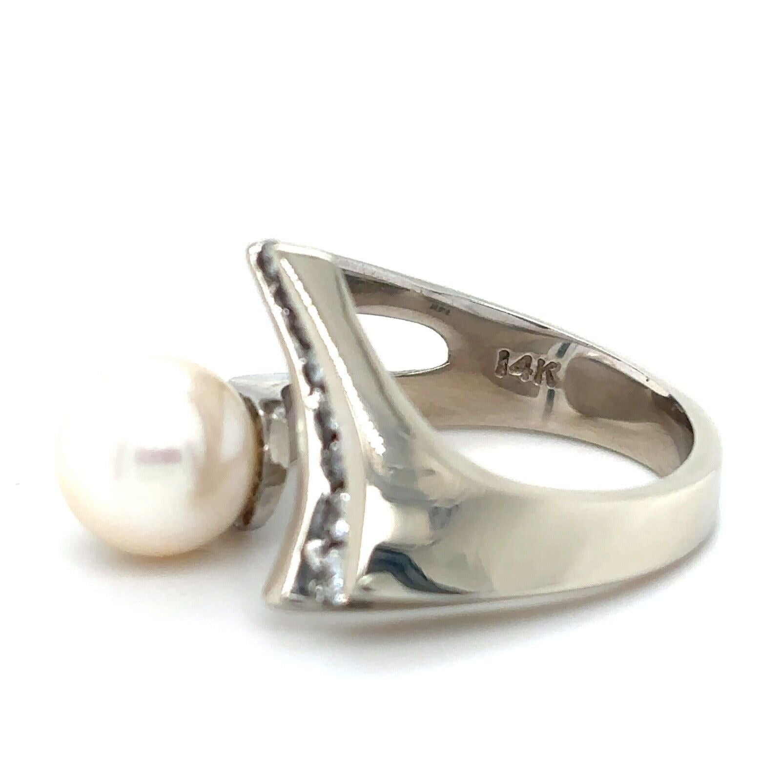 14K White Gold Ring W/ Pearl & 1/10ctw Diamonds Size 6 7g Elegant Modern Design Stunning Gift Or Statement Piece