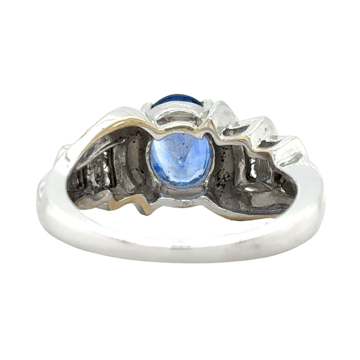 The 14k White Gold Sapphire and Diamond Size 7 Ring 6.5g is a beautiful piece of fine jewelry featuring an oval-shaped natural blue sapphire as the main stone. The ring is set with a solitaire style with accents of 10 G-colored diamonds, making it a stunning and elegant accessory for any occasion. The ring also comes with a seller warranty!