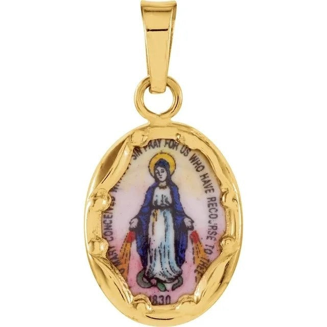 14K Yellow 13x10 mm Oval Hand Painted Porcelain Miraculous Medal Pendant