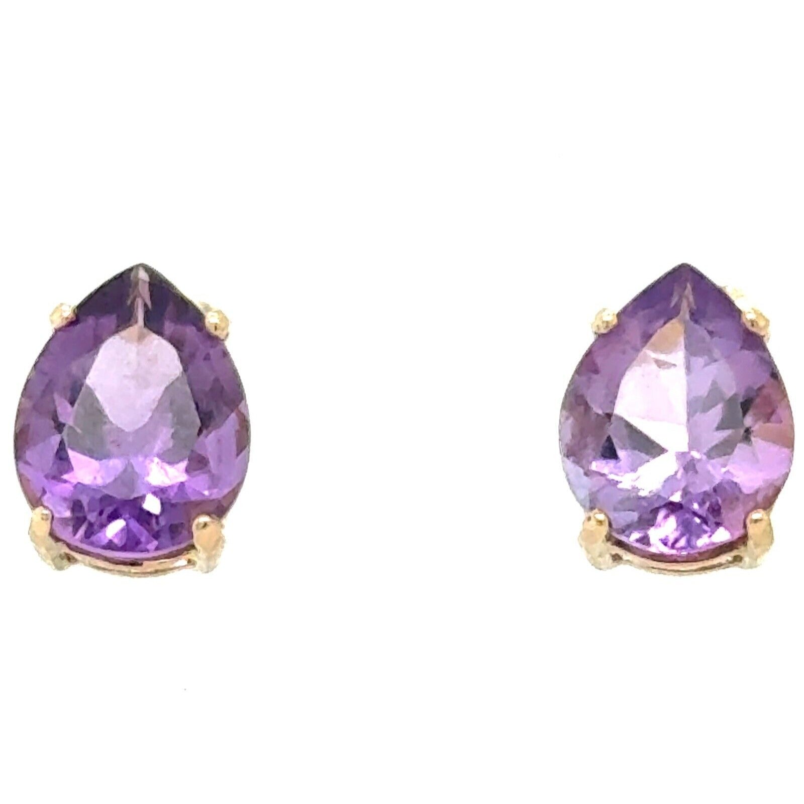 Elevate your jewelry collection with the timeless elegance of these 14k Yellow Gold Amethyst Stud Earrings. Each earring features a pear-shaped amethyst securely held in a prong setting, radiating a rich purple hue that adds a touch of sophistication to any outfit. The 14k yellow gold provides a warm, classic backdrop for the gemstones, showcasing their natural beauty. Designed to be versatile and perfect for various occasions, these stud earrings are ideal for anniversaries, birthdays, or even as a thoughtful gift for Mother's Day. The butterfly closure ensures a comfortable fit, making them suitable for everyday wear or special events. With a seller warranty included, these amethyst studs are not just an accessory but a statement of lasting value.