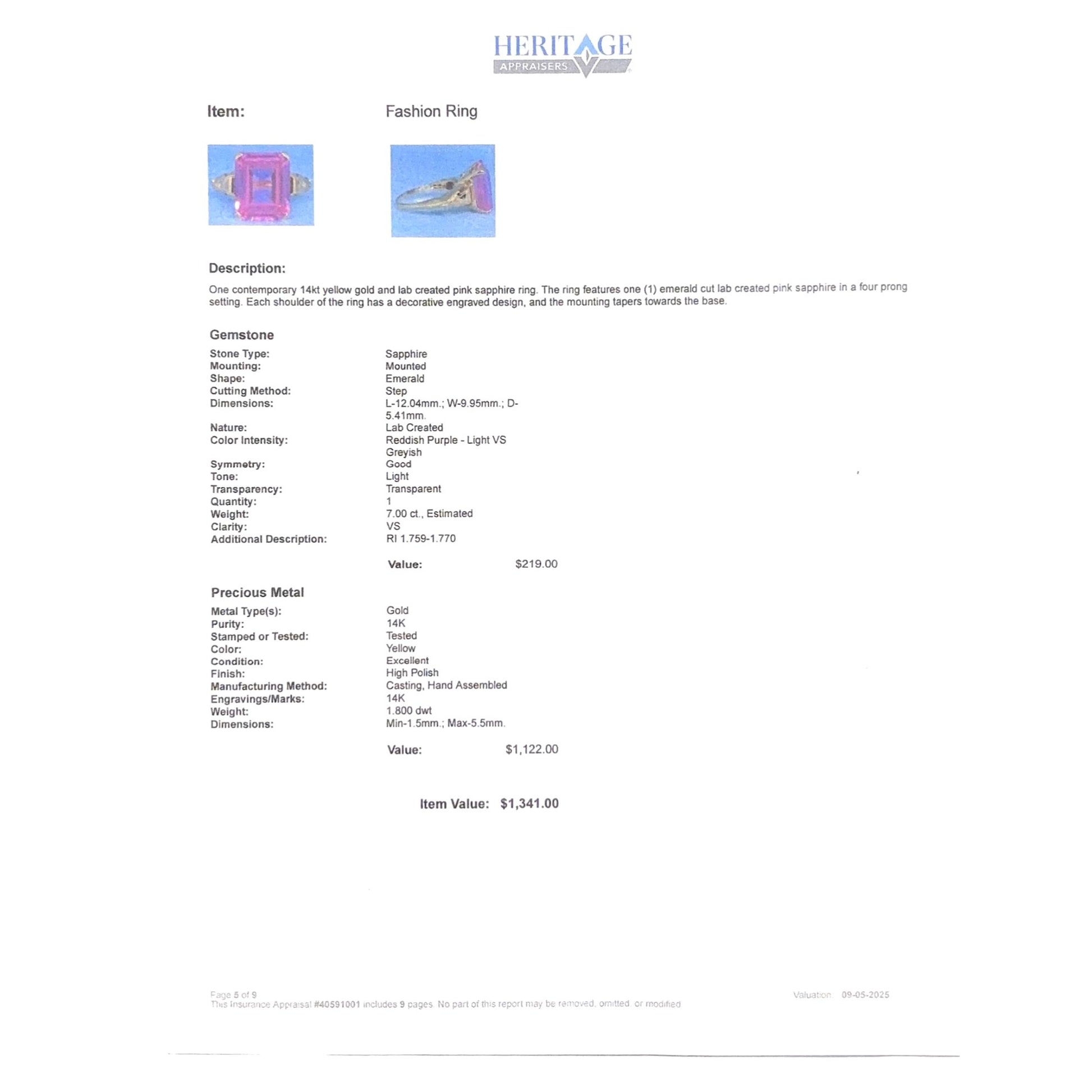 This stunning ring features a vibrant synthetic pink sapphire set in 14K gold. The elegant design and eye-catching color make it a sophisticated choice for jewelry enthusiasts seeking a luxurious addition to their collection.