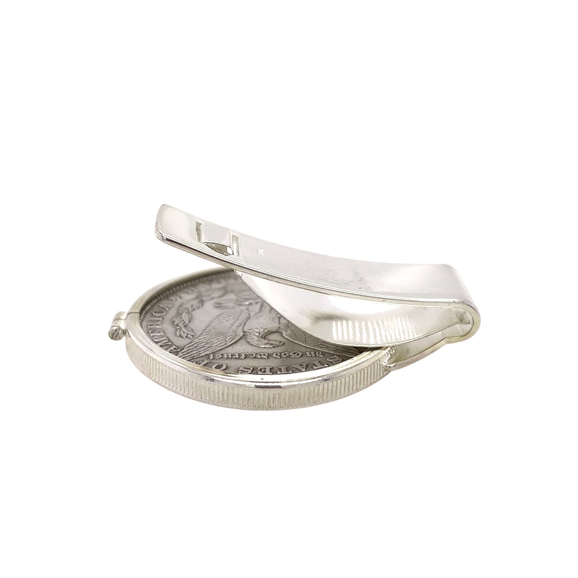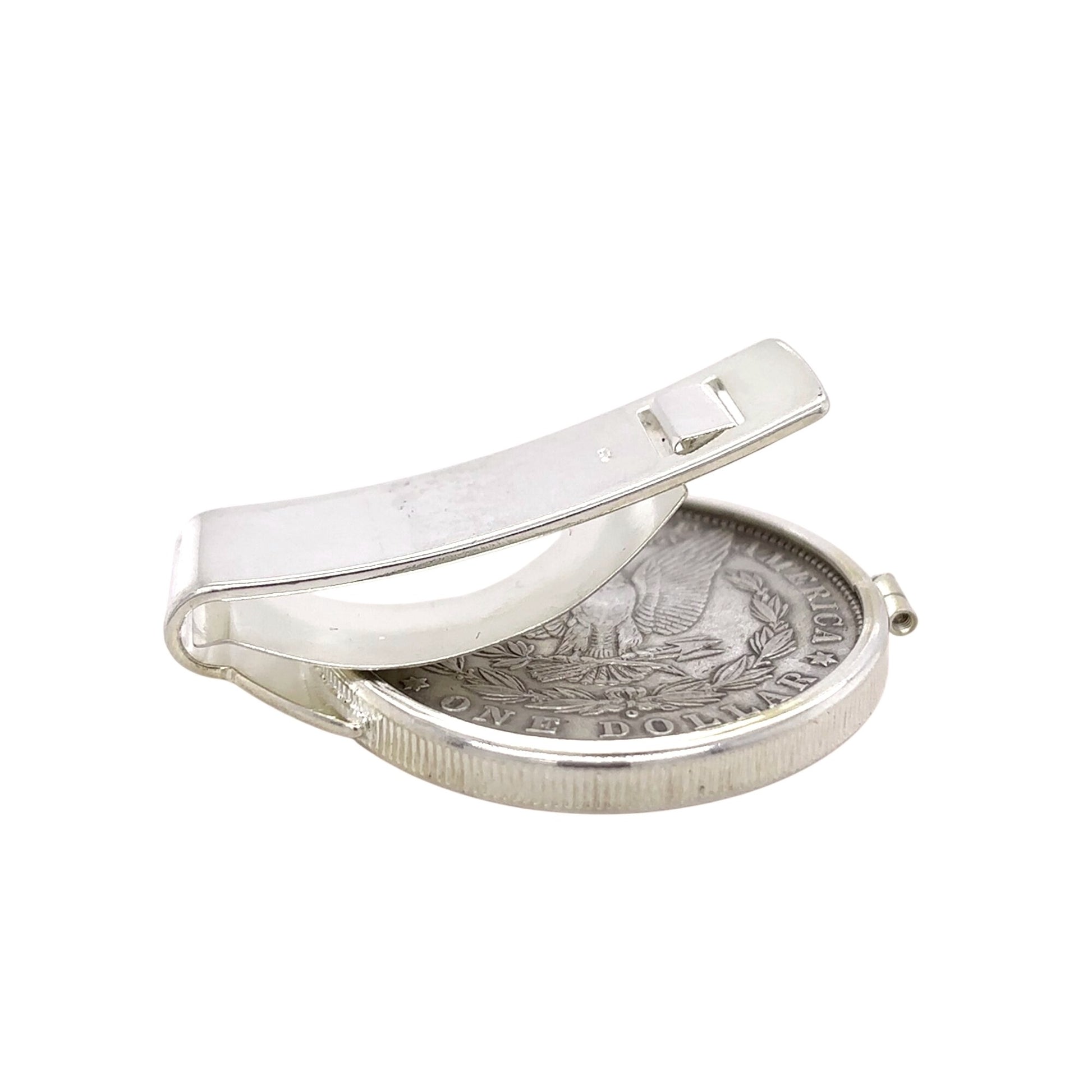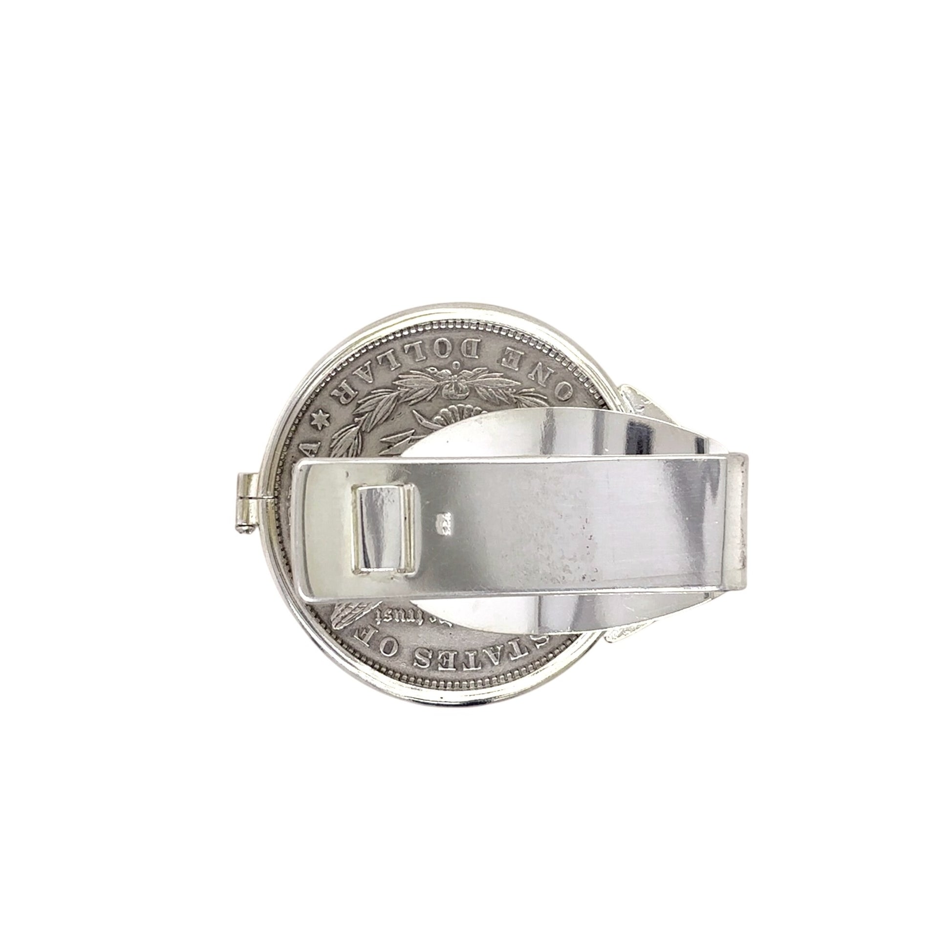 This money clip features an authentic 1880 Morgan dollar, elegantly set in sterling silver. A refined accessory for securing bills and cards with a touch of historical charm. The durable construction ensures longevity, making it both a practical and stylish choice for those who appreciate fine craftsmanship.