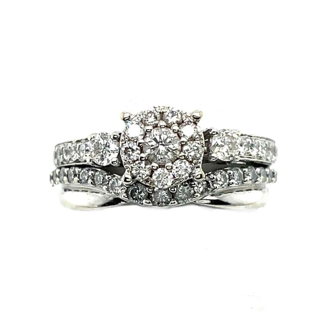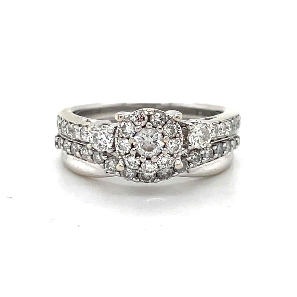 Celebrate love and commitment with this stunning 1ctw diamond bridal set. Crafted in 14K white gold, its halo design and shimmering accents radiate elegance.