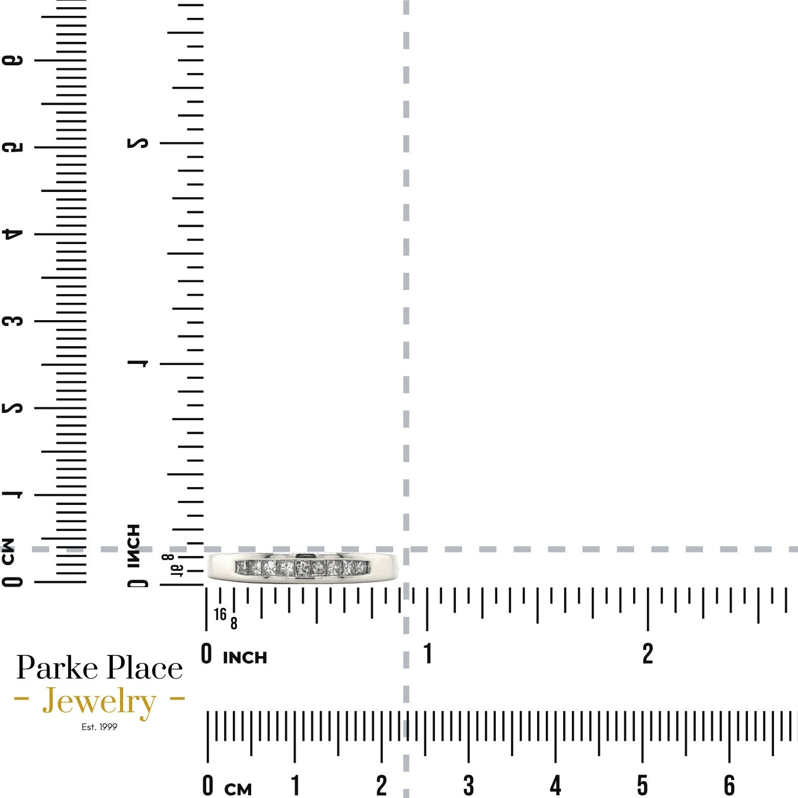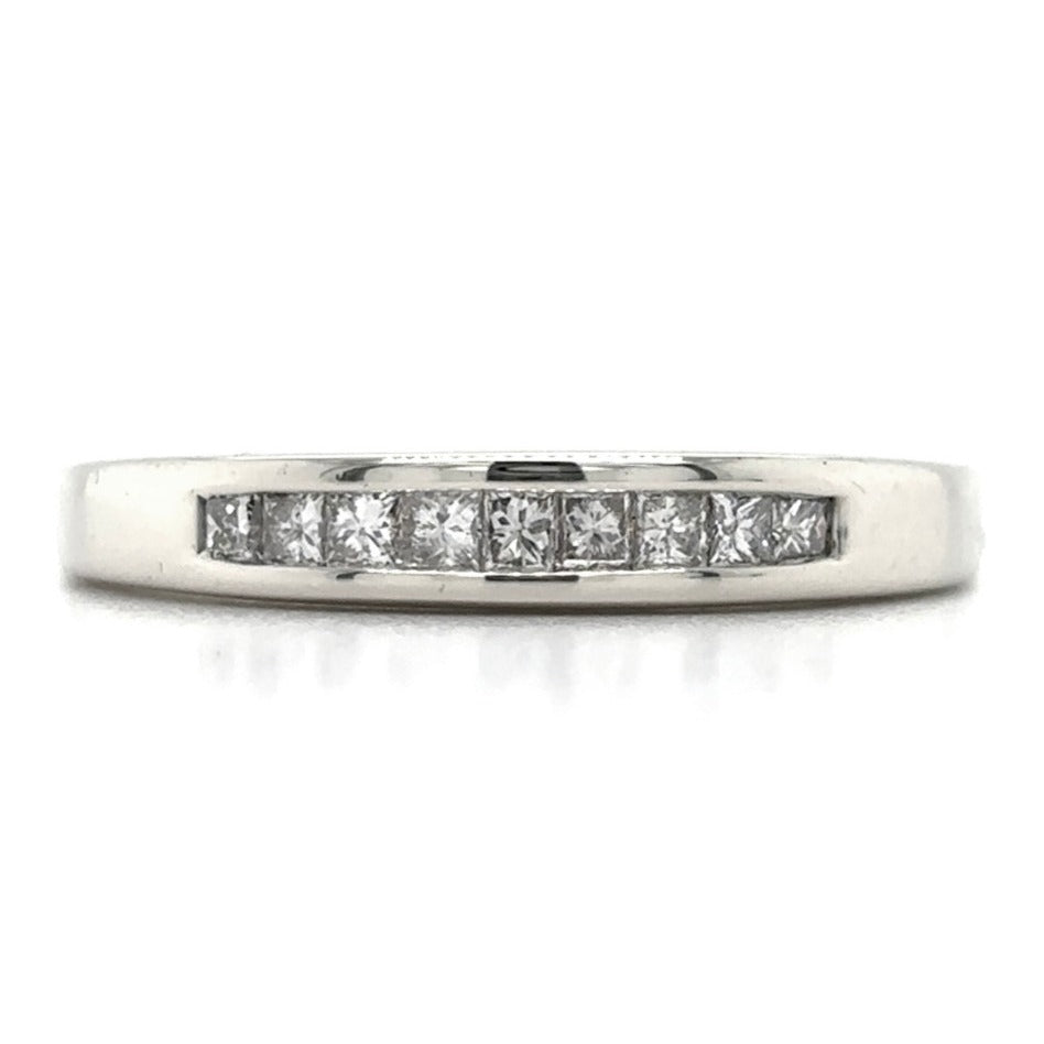 This elegant 3mm 14k white gold band ring features 9 channel-set princess-cut diamonds totaling 1/3ctw. The ring is crafted from 14k white gold, making it a beautiful and timeless piece of fine jewelry. With a band width of 3mm, this ring exudes beauty and sophistication, making it a perfect gift for a loved one or a stylish accessory for yourself!