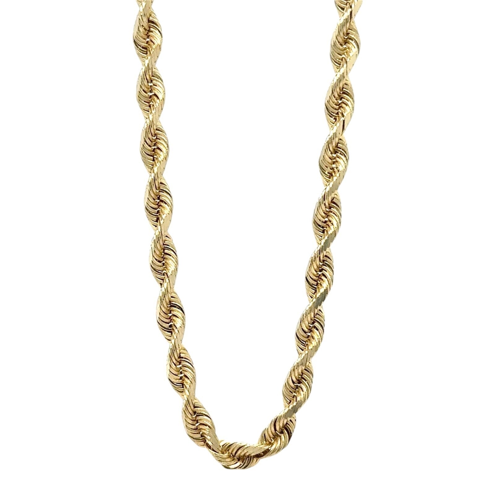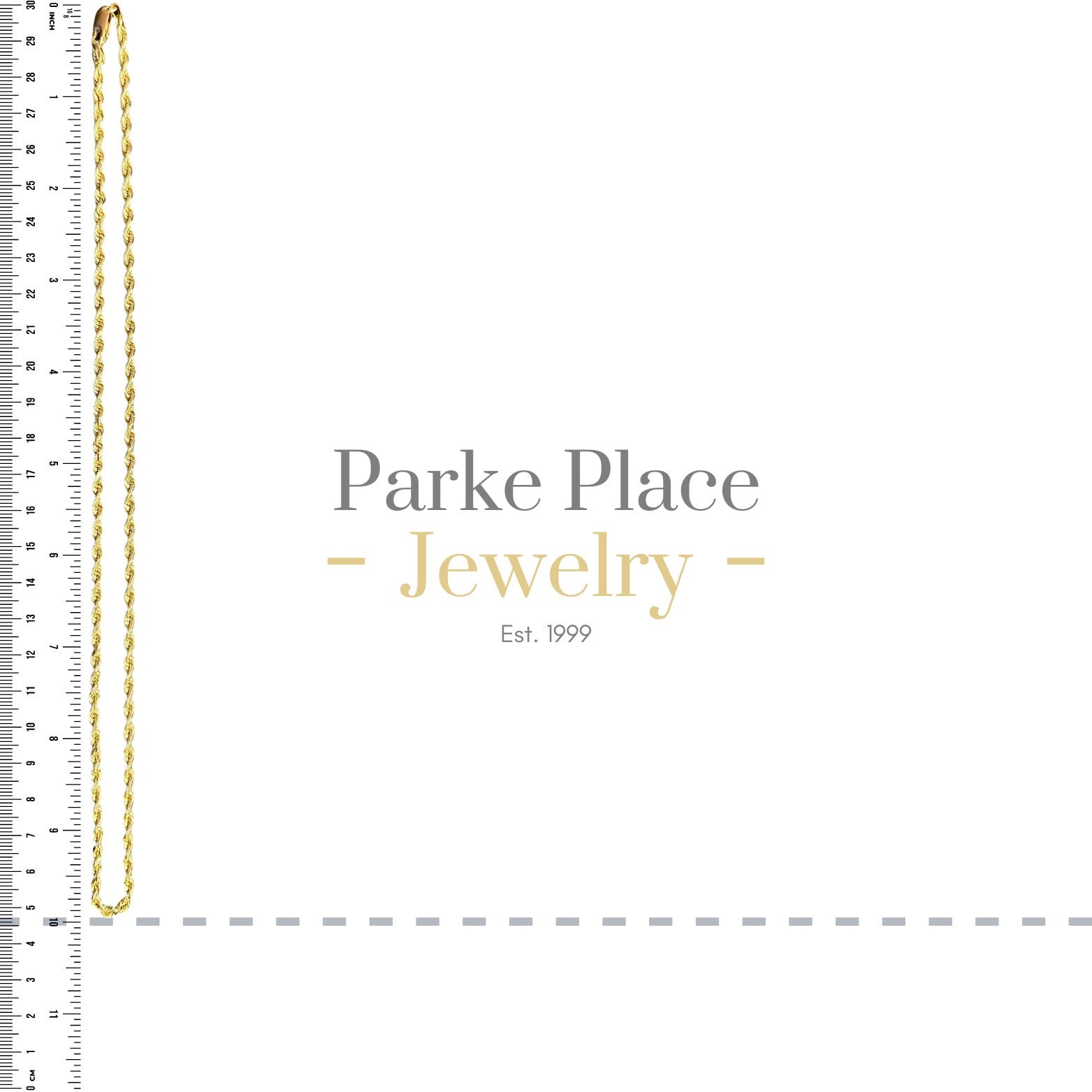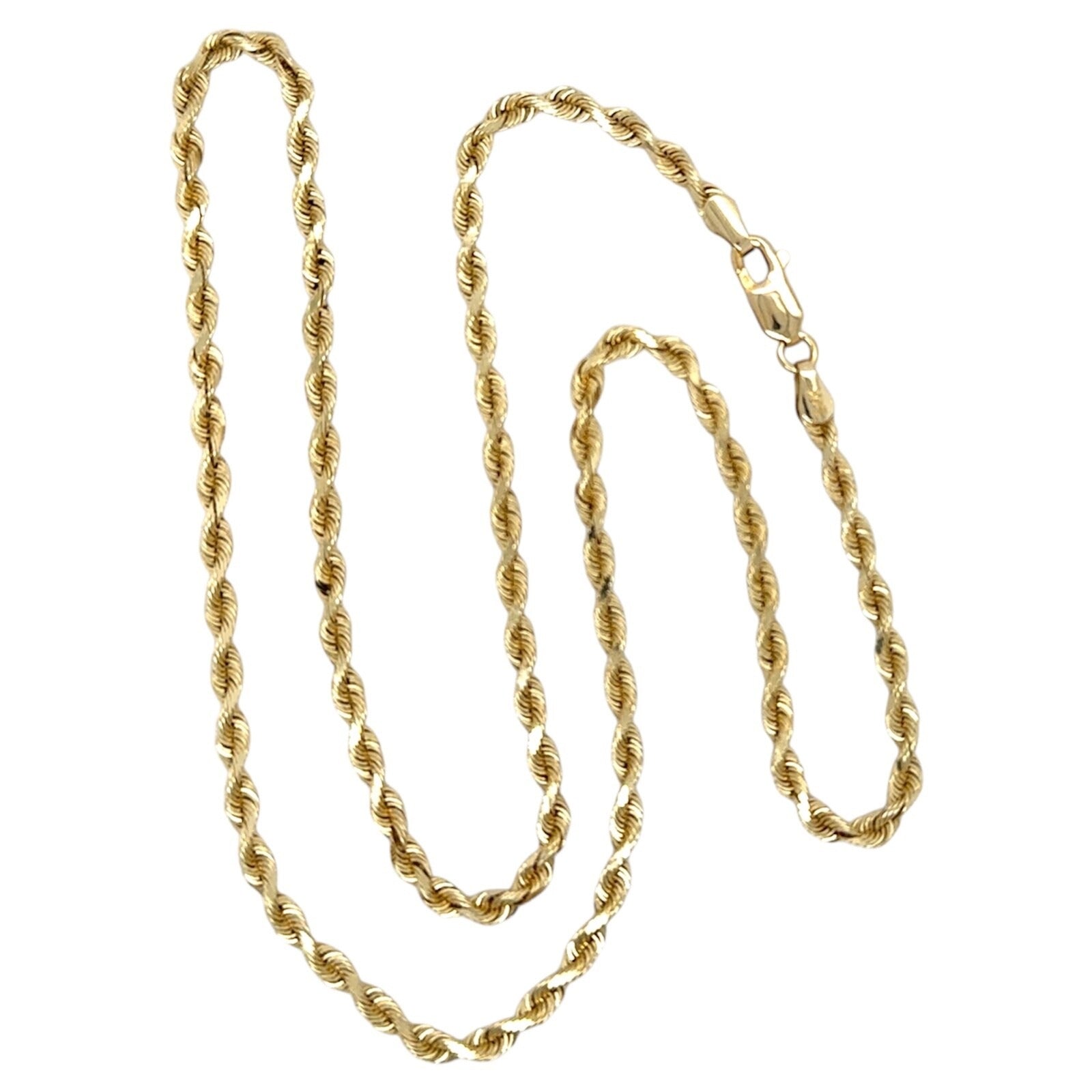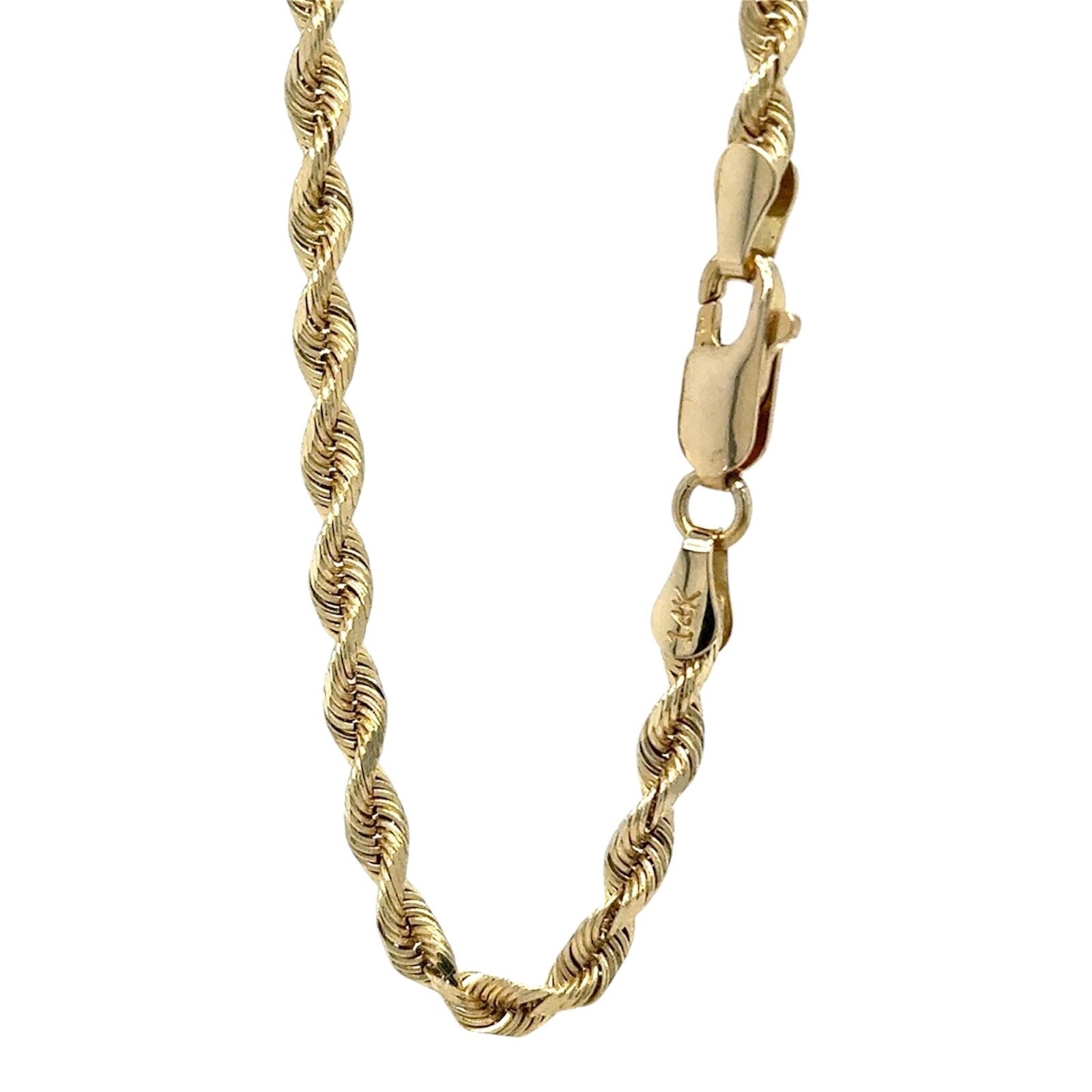 Crafted with elegance, this 3mm rope chain is a timeless piece made from 14k yellow gold, offering a warm and classic hue that complements any outfit. The chain is a generous 20 inches in length. Its sturdy lobster clasp closure provides secure fastening for everyday wear or special occasions. The necklace's simplicity allows it to serve as a versatile accessory or a thoughtful gift. This is a piece that continues to resonate with beauty and sentiment. The absence of stones emphasizes the golden beauty, making it an understated yet impactful choice.