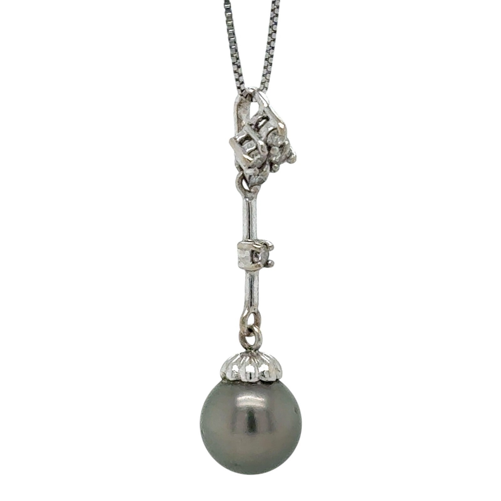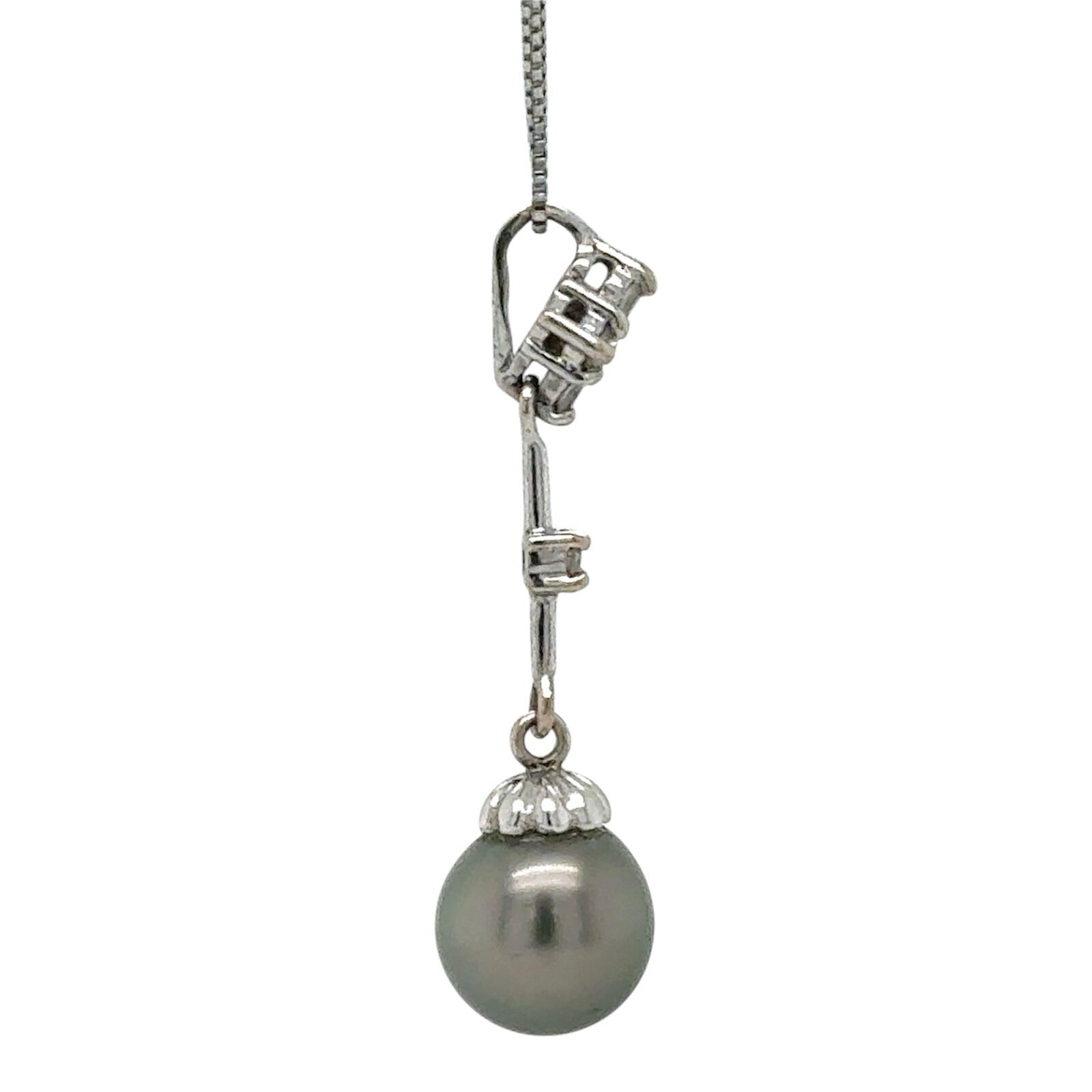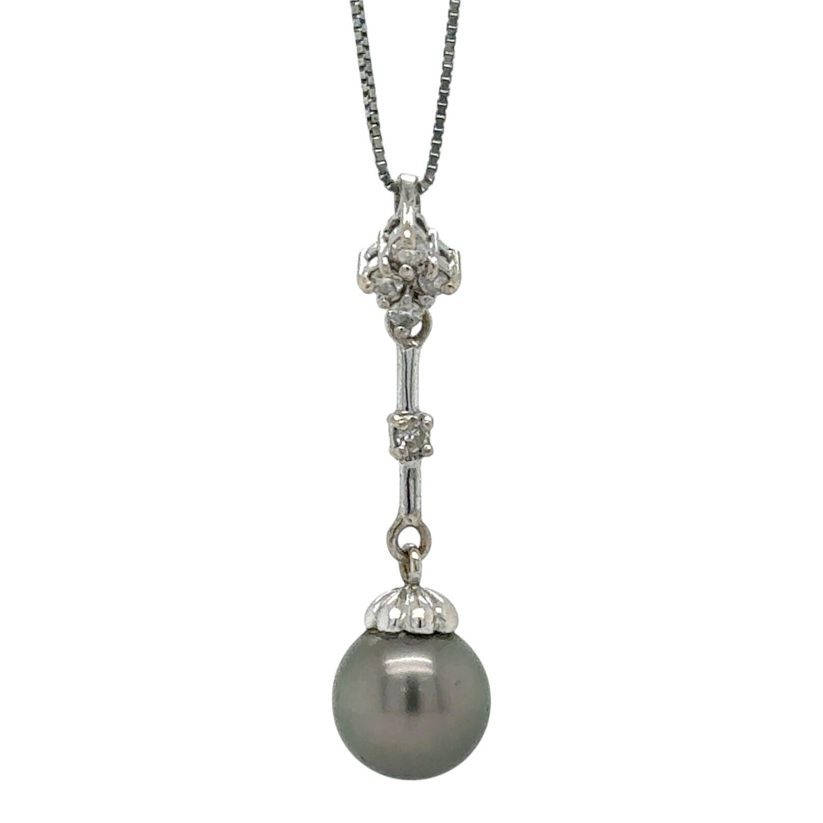 Black Pearl & Diamond 14k White Gold Pendant 19" Baby Box Chain 2.8g