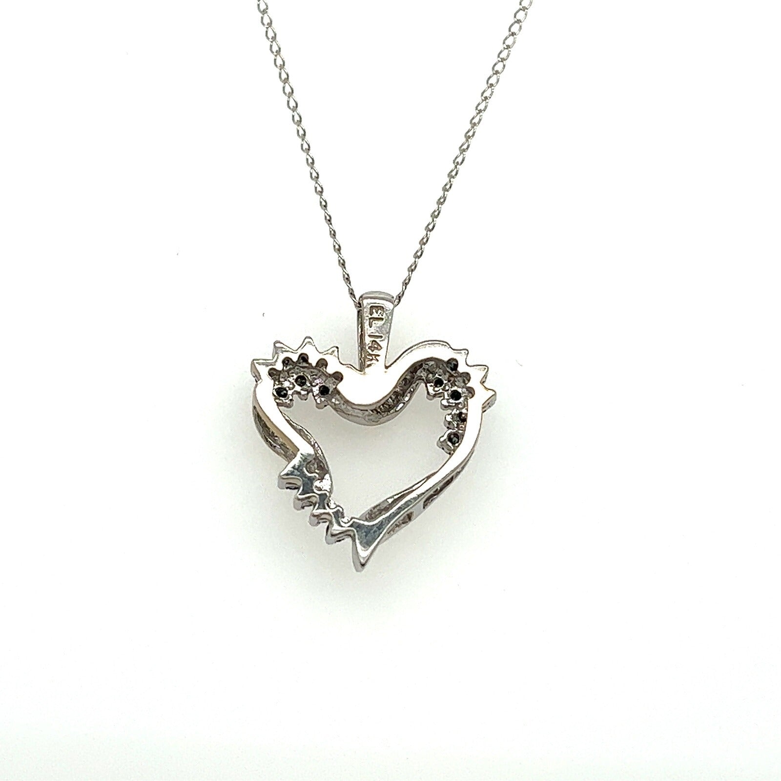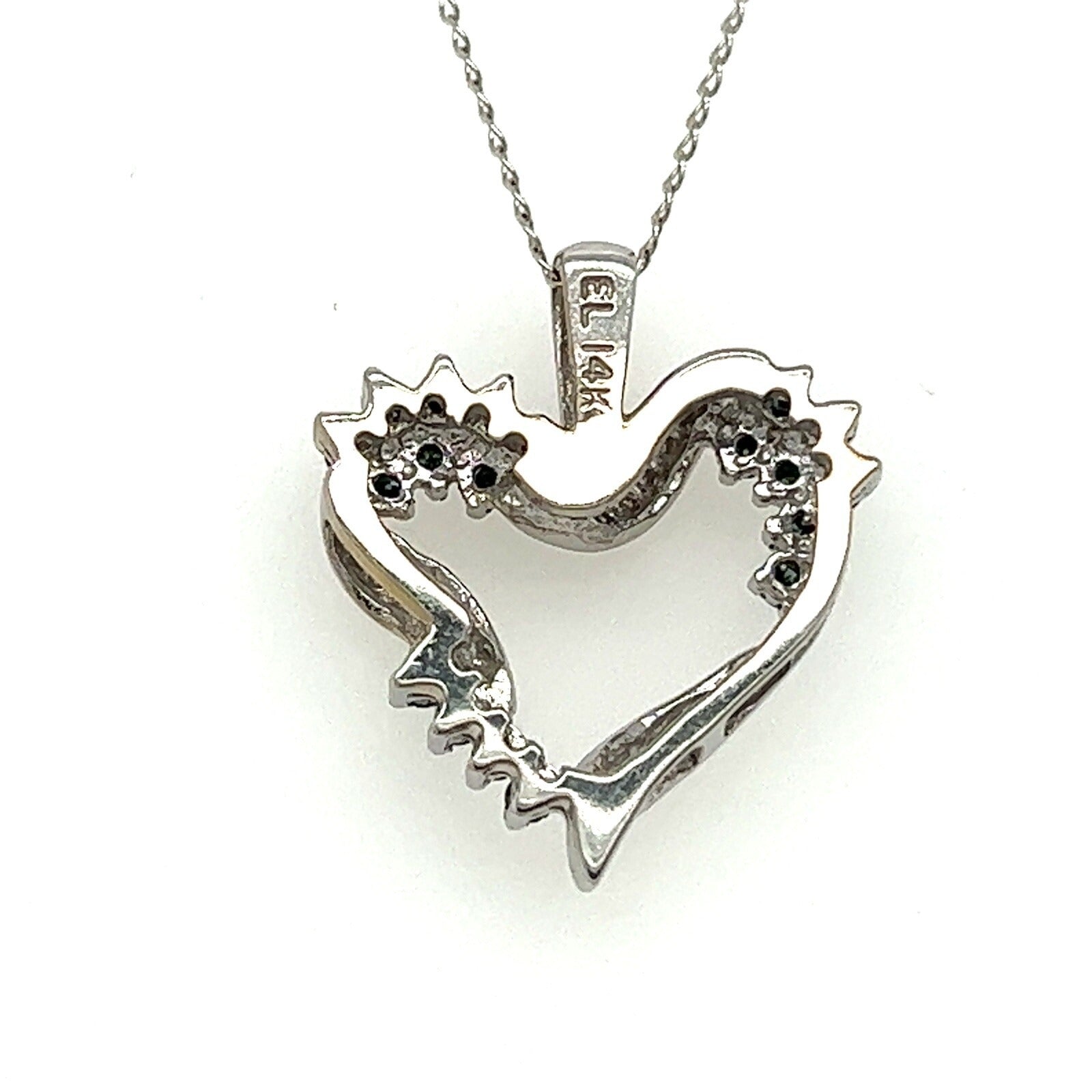 This beautiful heart-shaped pendant is a stunning piece of jewelry that is sure to capture your heart. The pendant is made from 14k white gold and features a dazzling blue diamond at the center. The pendant is suspended from a 16-inch chain that is also made from solid 14k white gold.