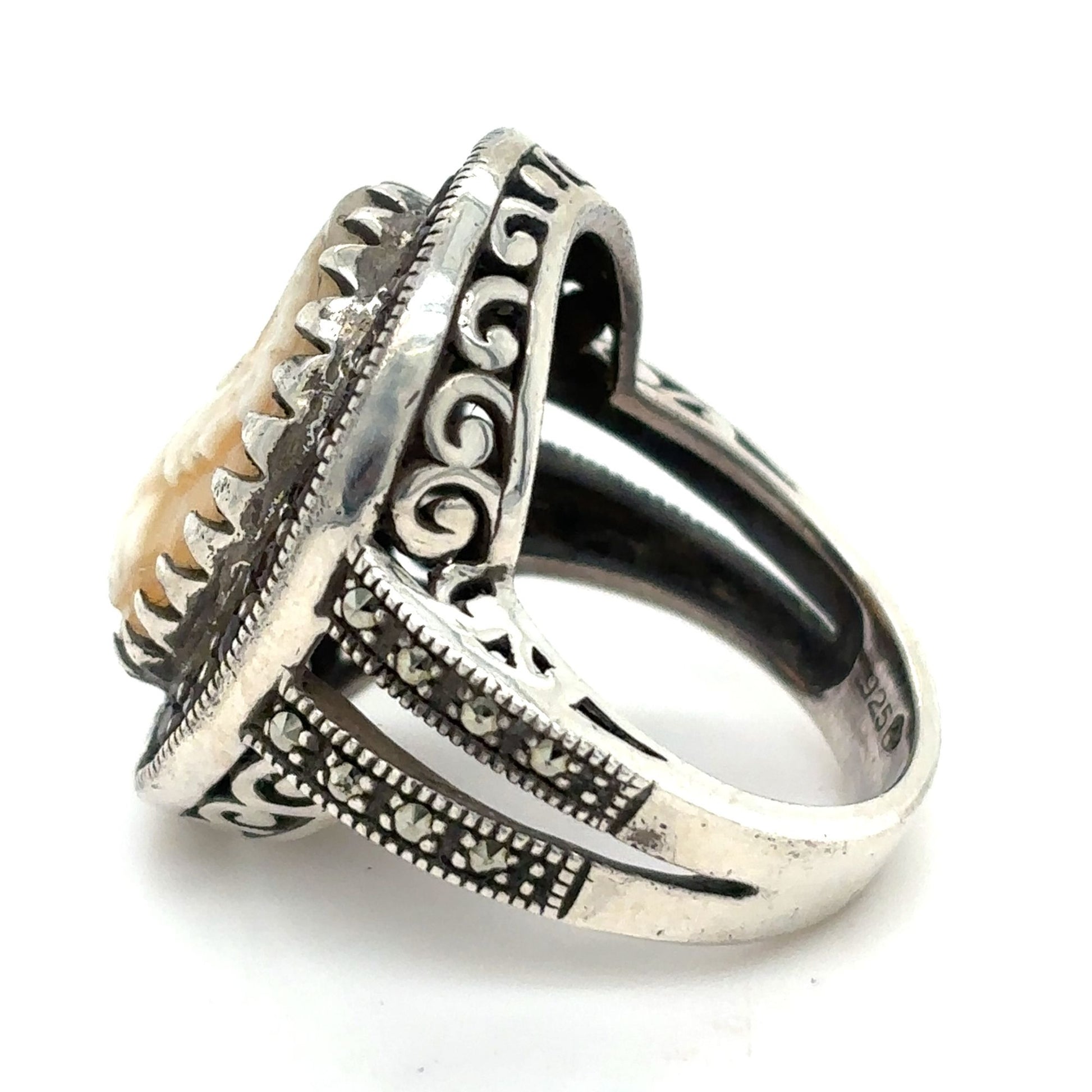 This sterling silver ring showcases a detailed cameo centerpiece surrounded by garnet accents. Weighs 9.4g and is a size 6.