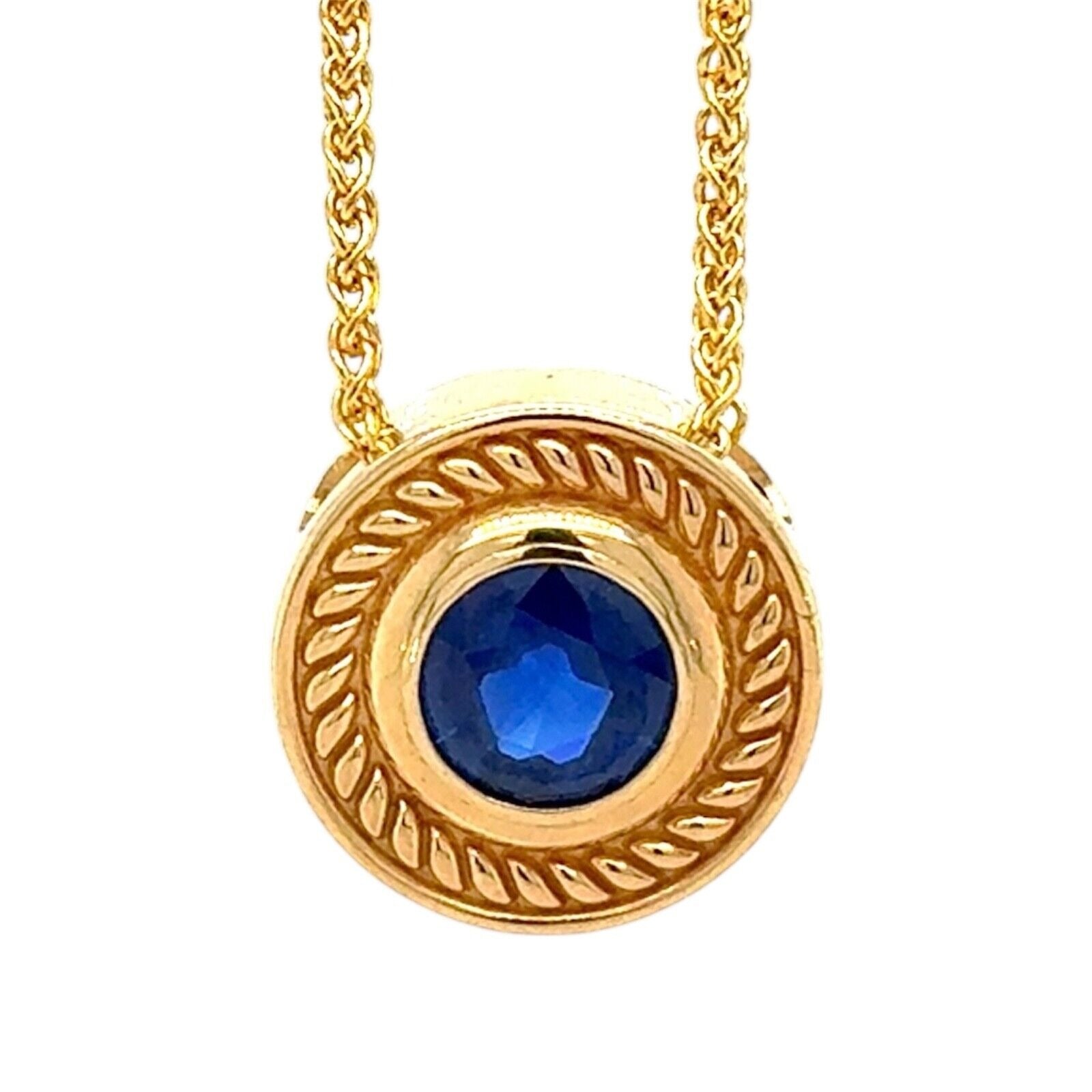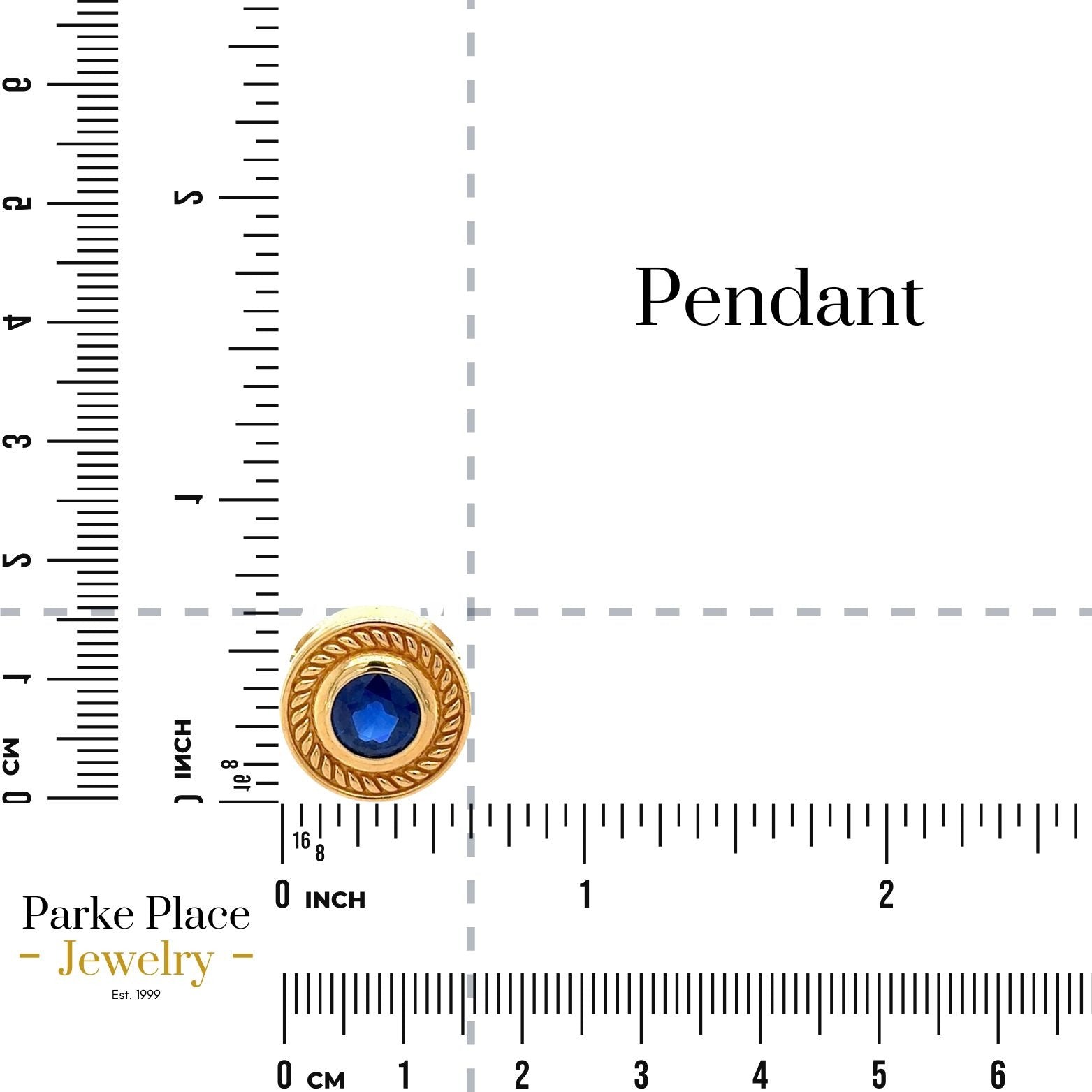 This Created Blue Sapphire Pendant 17in Necklace & Earrings Set is a stunning fashion jewelry set made with 14k yellow gold. The set includes a necklace with a pendant featuring a created blue sapphire stone, as well as matching earrings. The main stone color is blue, and it is shaped in a round design.