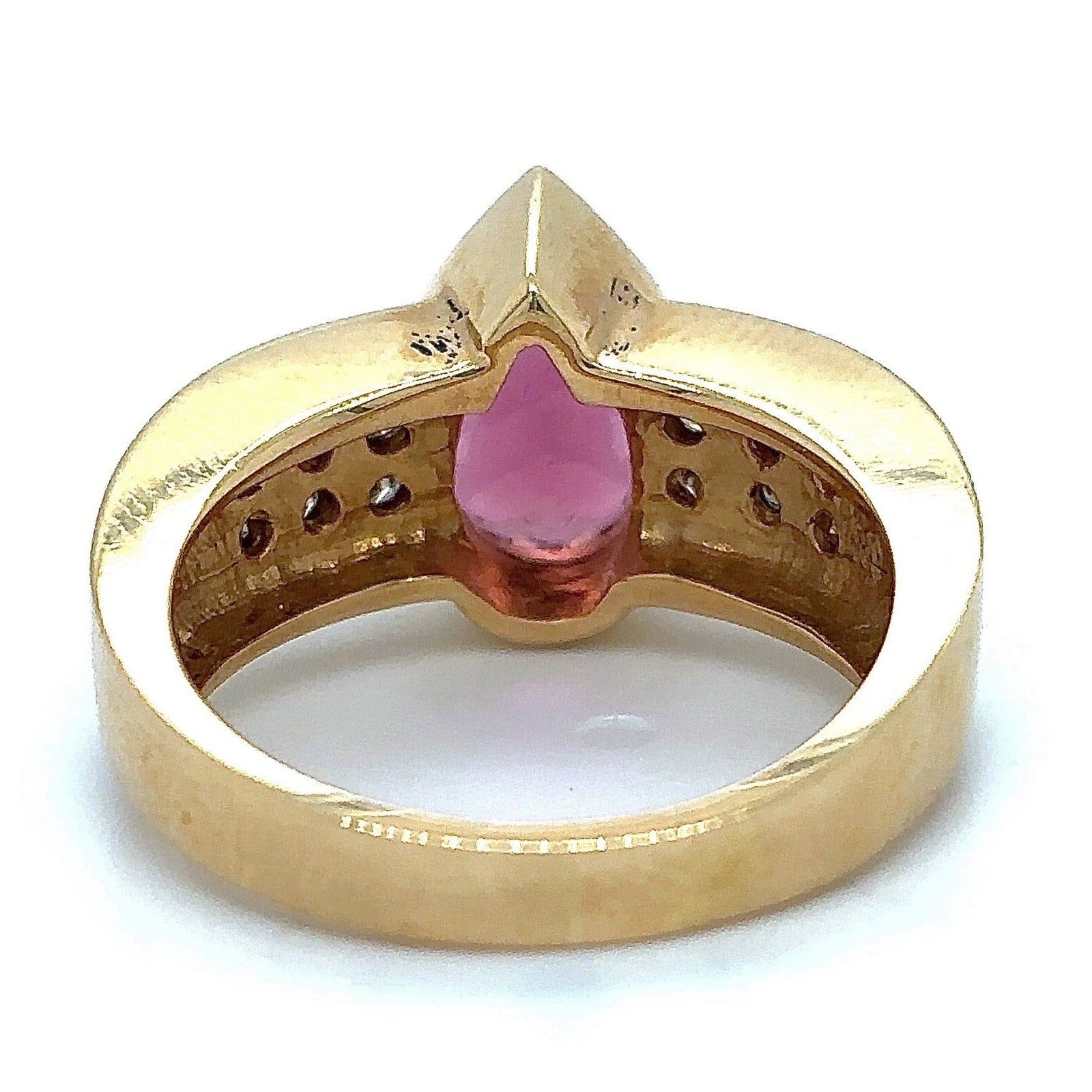 This exquisite pink tourmaline solitaire ring is made of real, solid 14k gold and features accents that add a touch of elegance to your jewelry collection. The pear-shaped main stone is a natural pink tourmaline that has not been enhanced, and is complemented by secondary tourmaline stones. This ring is perfect for occasions such as Mother's Day, Christmas, anniversaries, birthdays, and Valentine's Day. It is also a vintage piece and comes with a seller warranty.