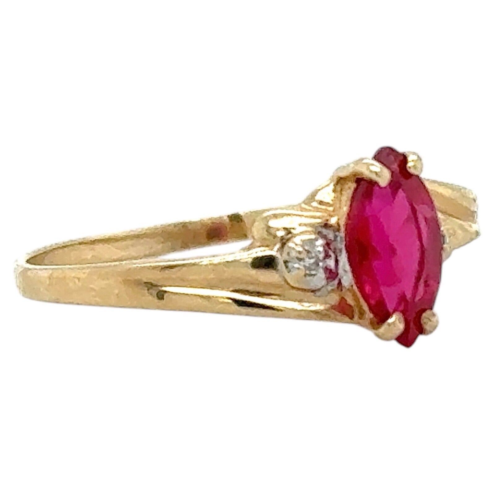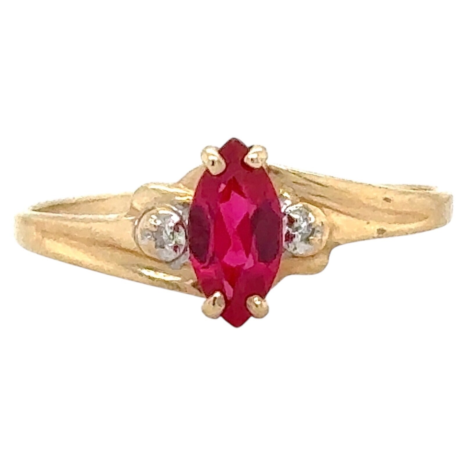 This Created Ruby Solitaire & Diamond 10k Yellow Gold Ring features a stunning red marquise-shaped simulated ruby as the main stone, accented with 2 sparkling diamonds. The 10k yellow gold setting in size 8.25 adds a touch of luxury and elegance to this jewelry piece.