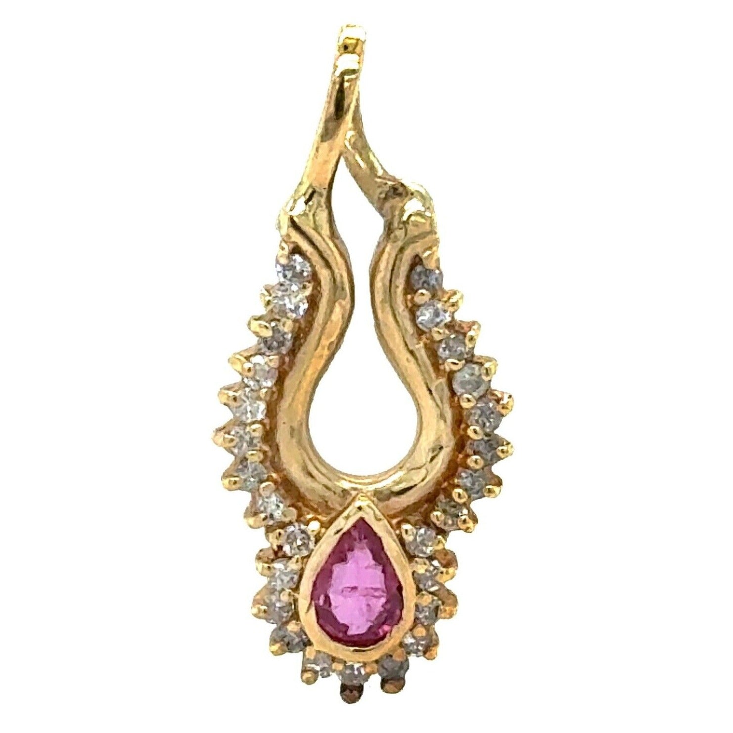 This gorgeous pendant is a perfect gift for any special occasion, with its stunning teardrop shape and beautiful ruby stone surrounded by 27 diamonds. Made from 14k yellow gold, this pendant is both elegant and durable, with a total carat weight of 1/2.