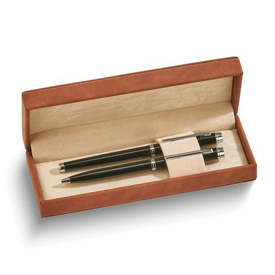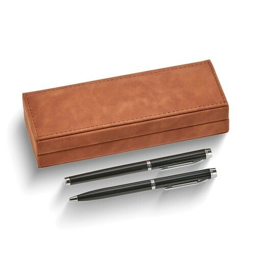 This sleek pen set includes two black pens enclosed in a brown leather box, ideal for maintaining a polished and professional workspace or gifting.