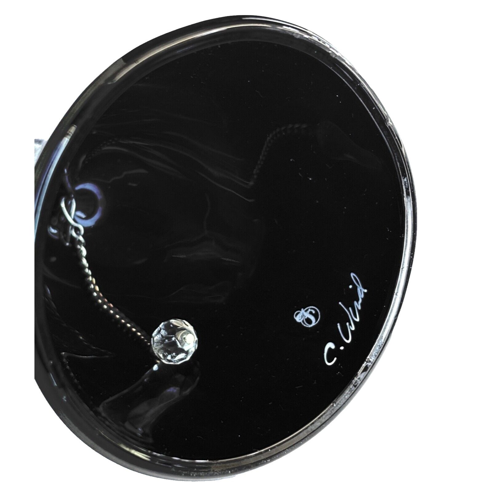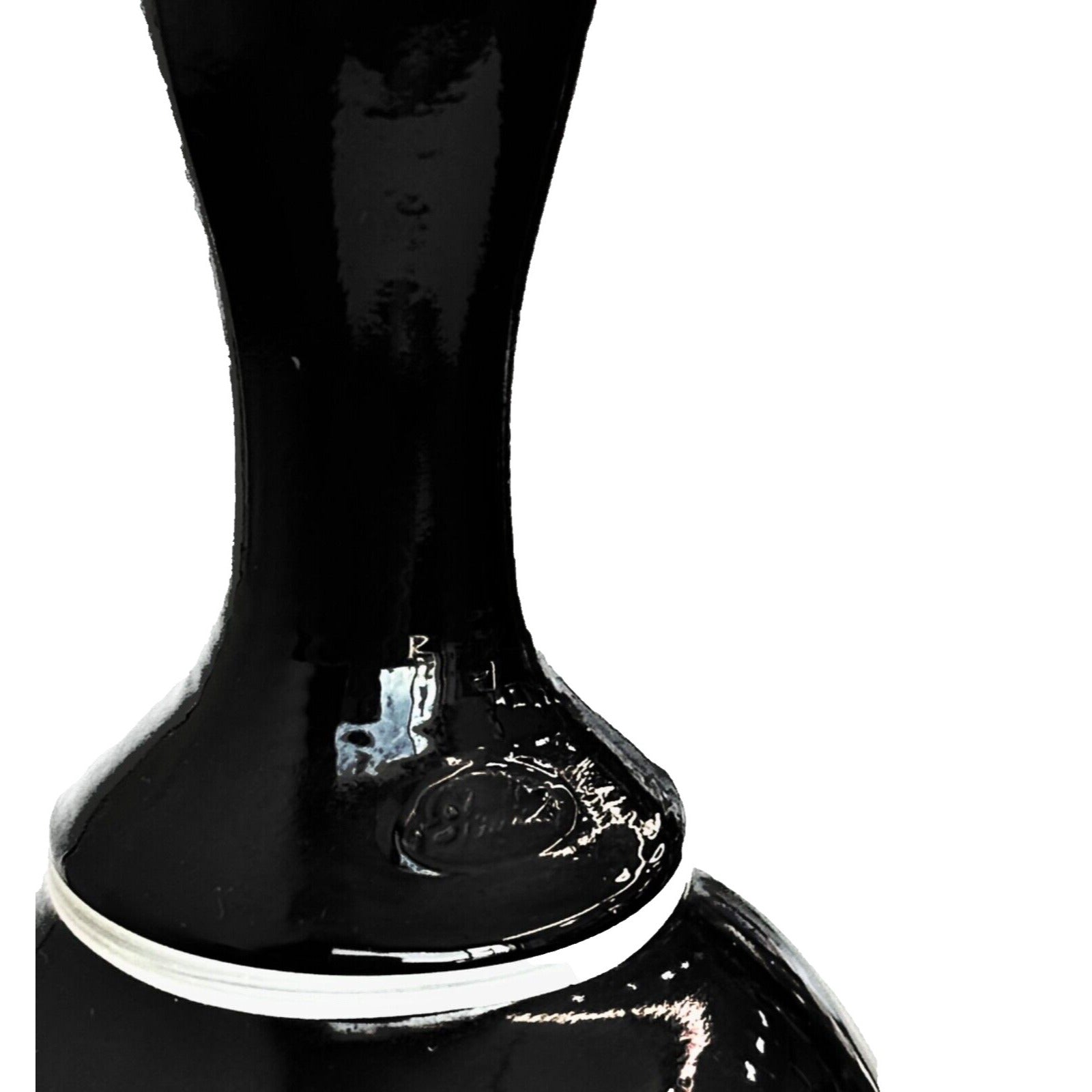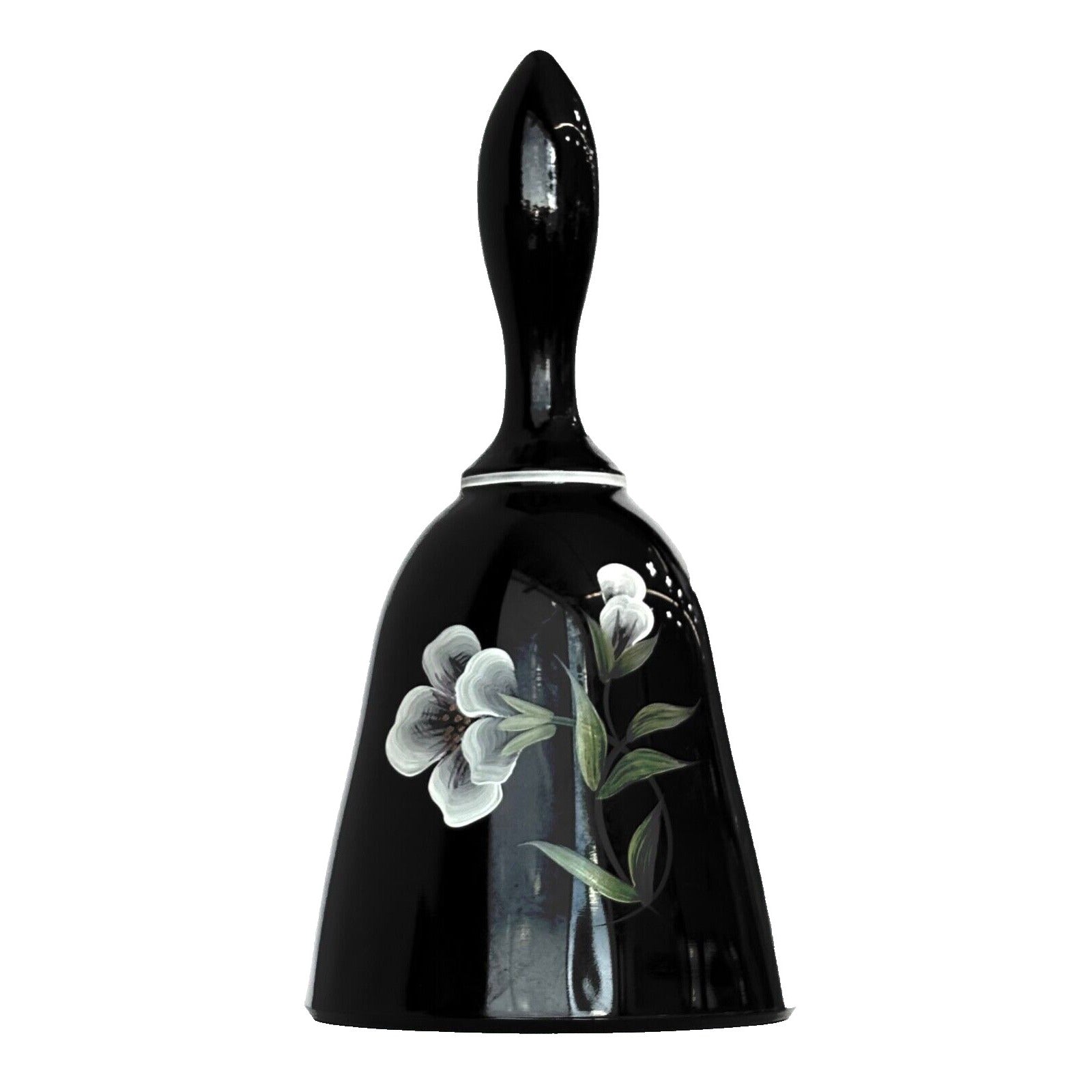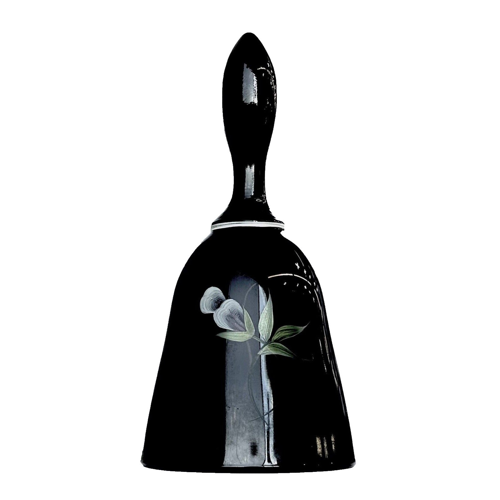This beautiful Fenton bell is a must-have for any collector. The black glass is adorned with hand-painted white floral designs, creating a stunning contrast. The bell is also signed, adding to its value. The bell measures 7 inches in height, 3 inches in length, and 3 inches in width, making it a perfect display piece. The floral pattern is reminiscent of a vine, with delicate flower petals that add a touch of elegance. This vintage bell is sure to impress any guest and would make a wonderful addition to any home decor.