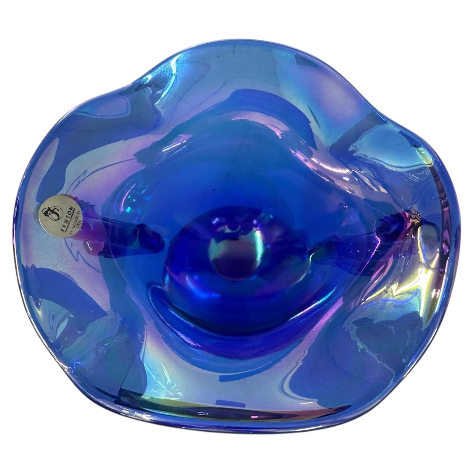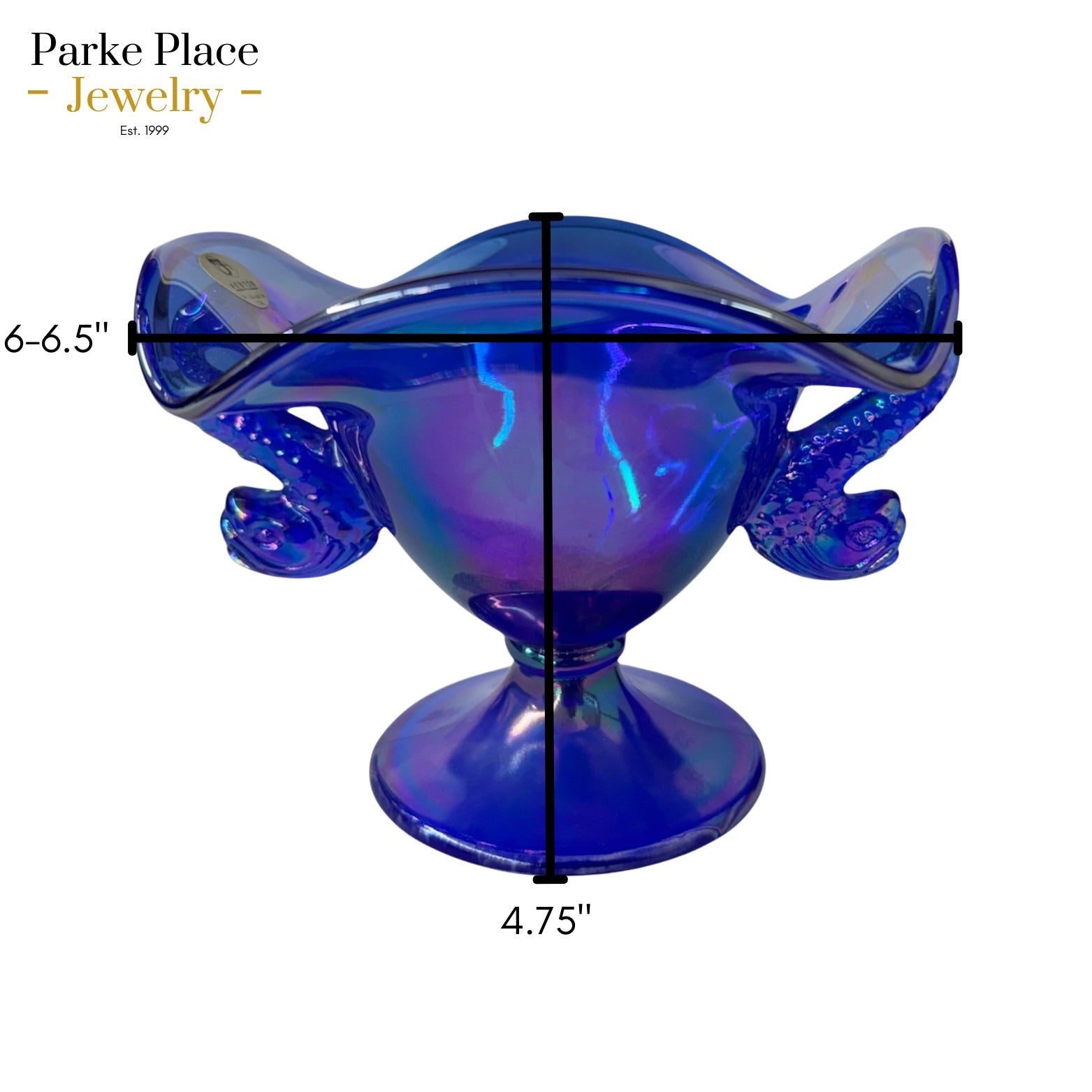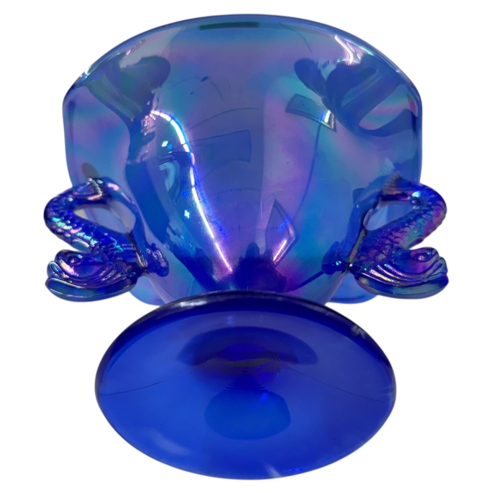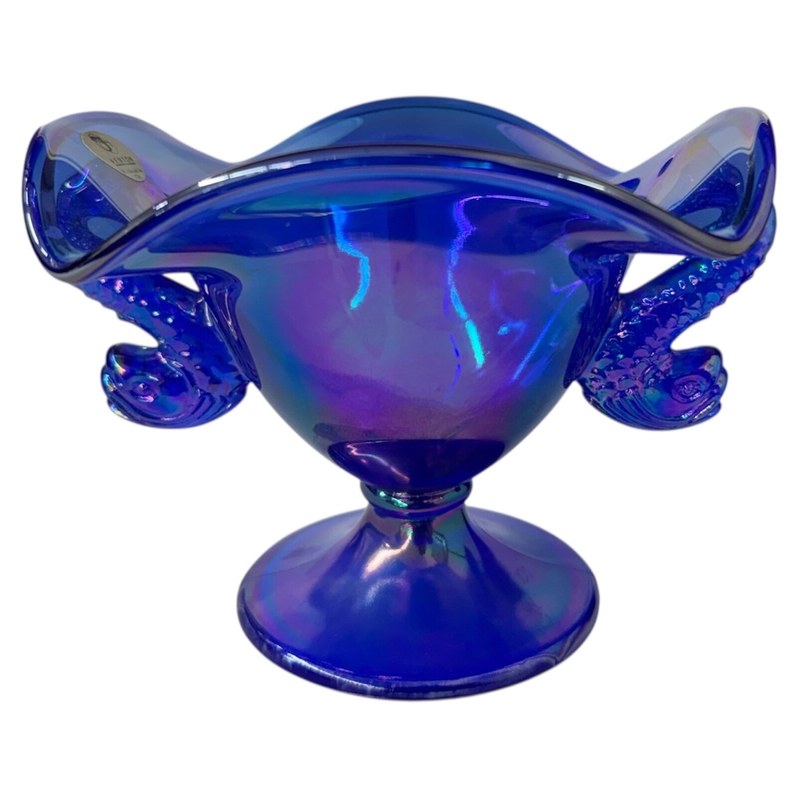 Fenton Double Koi Dolphin Blue Carnival Iridescent Glass Compote Bowl