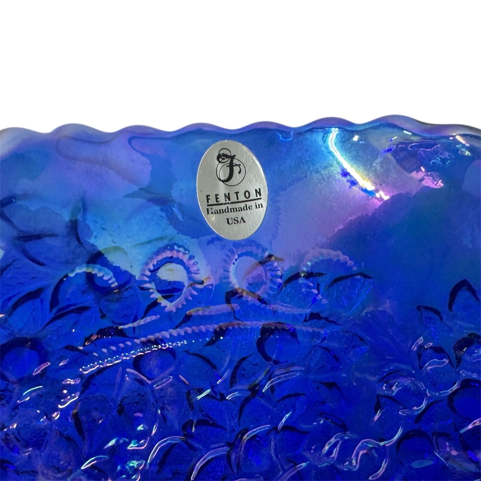 Fenton Glass Blue Iridescent Ruffled Edge Bowl Cherry Design 10"