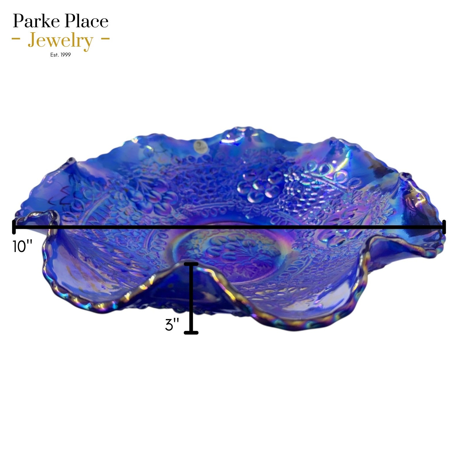 Elevate your home decor with the Fenton Glass Blue Iridescent Ruffled Edge Bowl, featuring a stunning cherry design that brings a touch of nature's elegance indoors. The bowl's vibrant multicolor palette is sure to become a conversation piece on any occasion, complementing both casual and formal settings alike. This piece measures 10 inches in diameter and stands 3 inches tall, perfect for showcasing as a centerpiece or storing small treasures. Its alluring ruffled edge adds a whimsical flair, making it a charming addition to your collection or as a thoughtful gift for someone special.