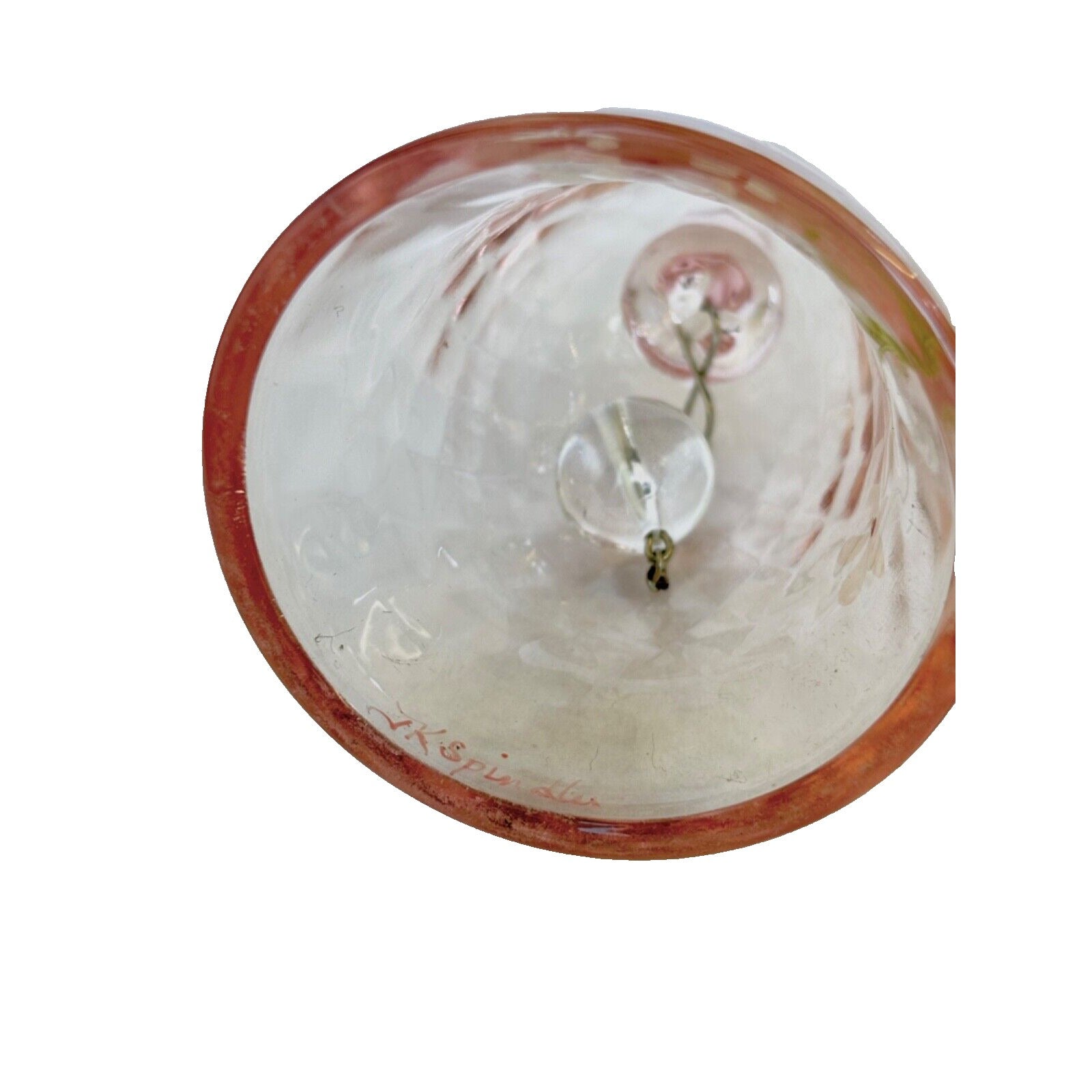 This beautiful Fenton bell is a must-have for any collector or lover of decorative items. The pink glass is complemented by hand-painted pink butterflies and white florals, making it a unique and eye-catching piece. The bell is signed and measures 4.5 inches in height, 2 inches in length and 2 inches in width. It features a floral pattern and a butterfly subject, with bells, flowers, and butterflies as its theme. The vintage style and decorative features make it a perfect addition to any home decor.