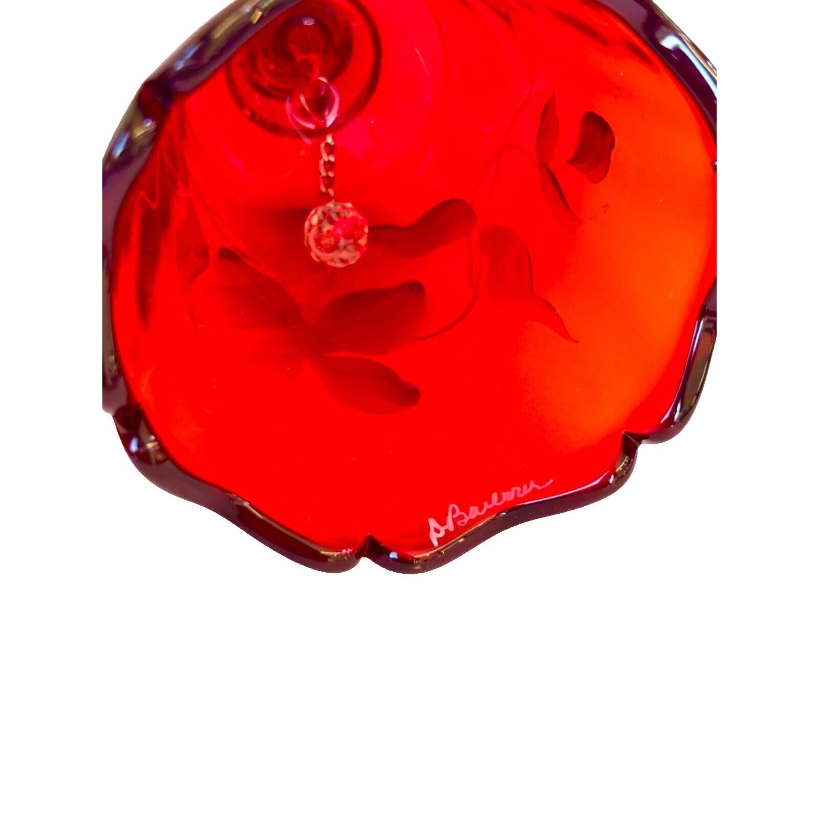 This beautiful Fenton bell features stunning pink floral designs hand-painted on red glass. The bell stands at 7 inches tall and has a length and width of 3 inches. It is a vintage piece and signed by the artist. The item is in excellent shape and ready to display in your home.