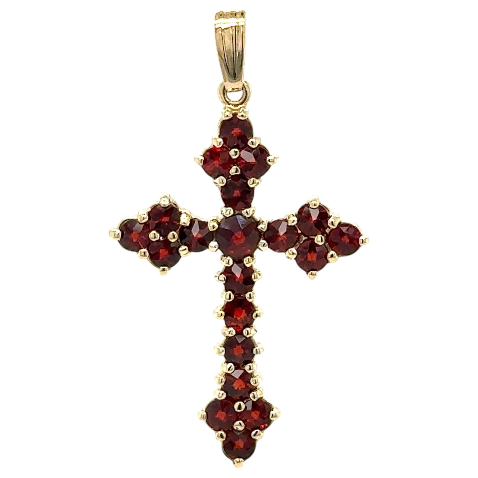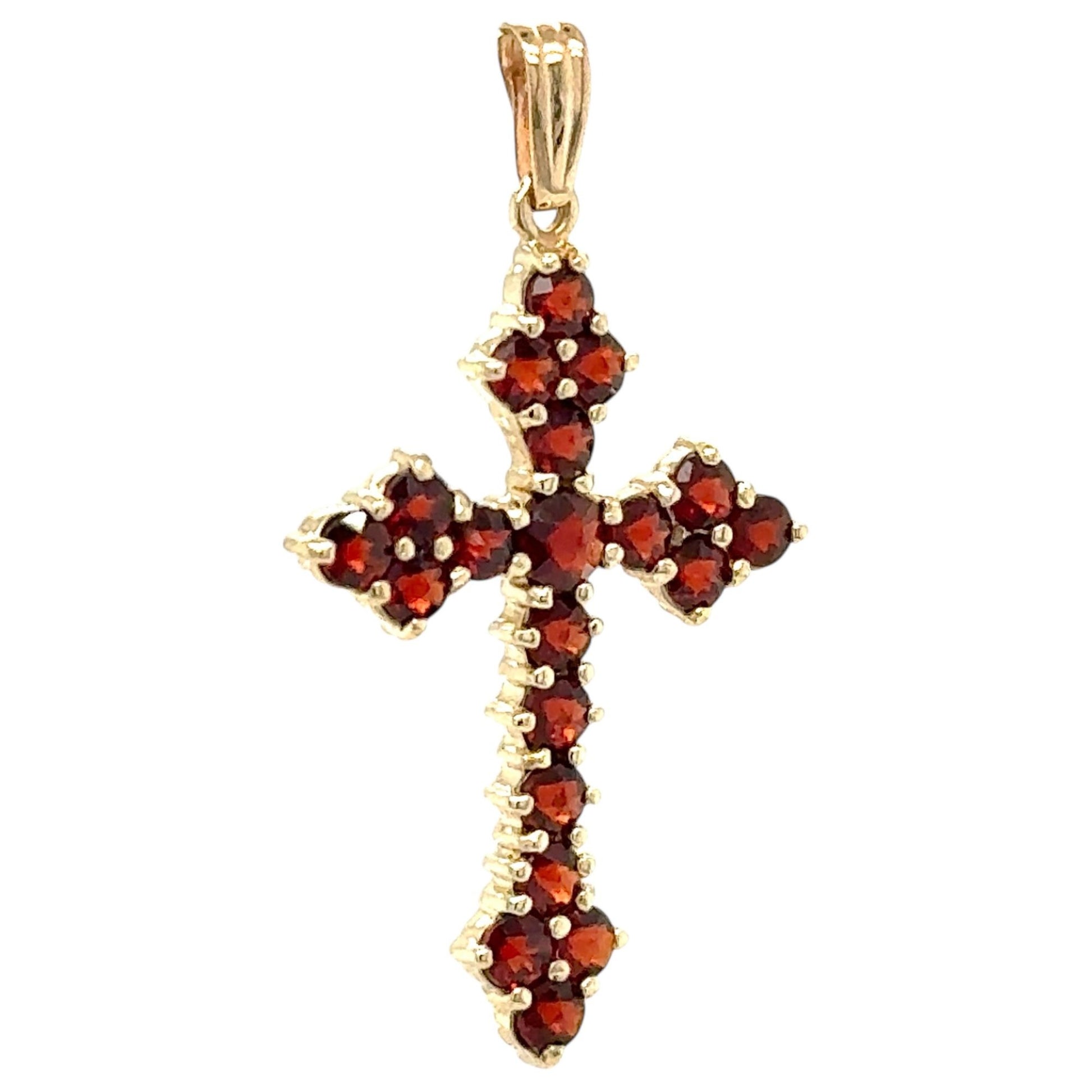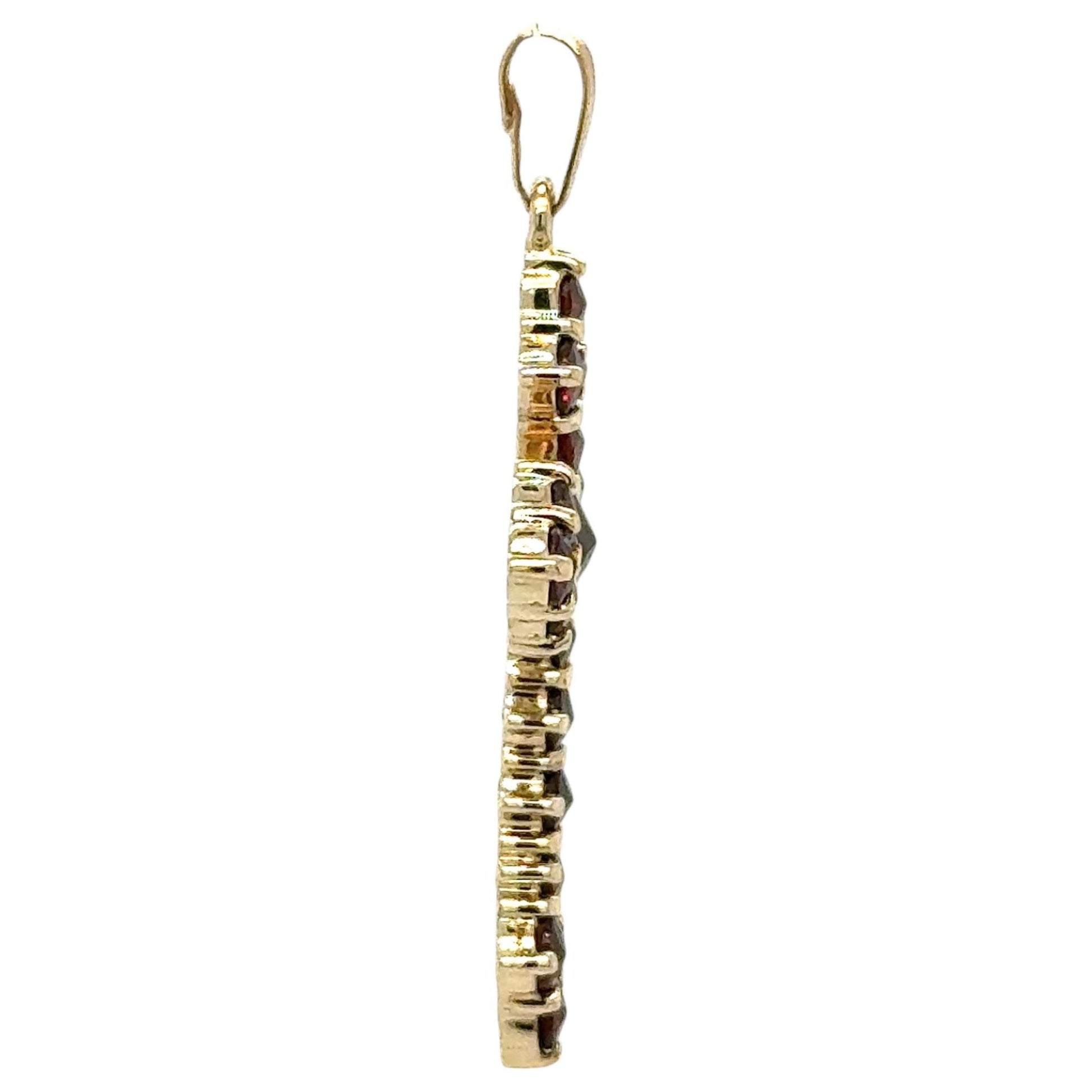 Elegant 10k yellow gold pendant featuring a stunning garnet cross design. Weighing 2.4 grams, this exquisite piece adds a touch of sophistication to any outfit.