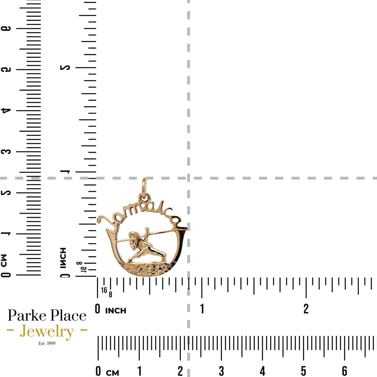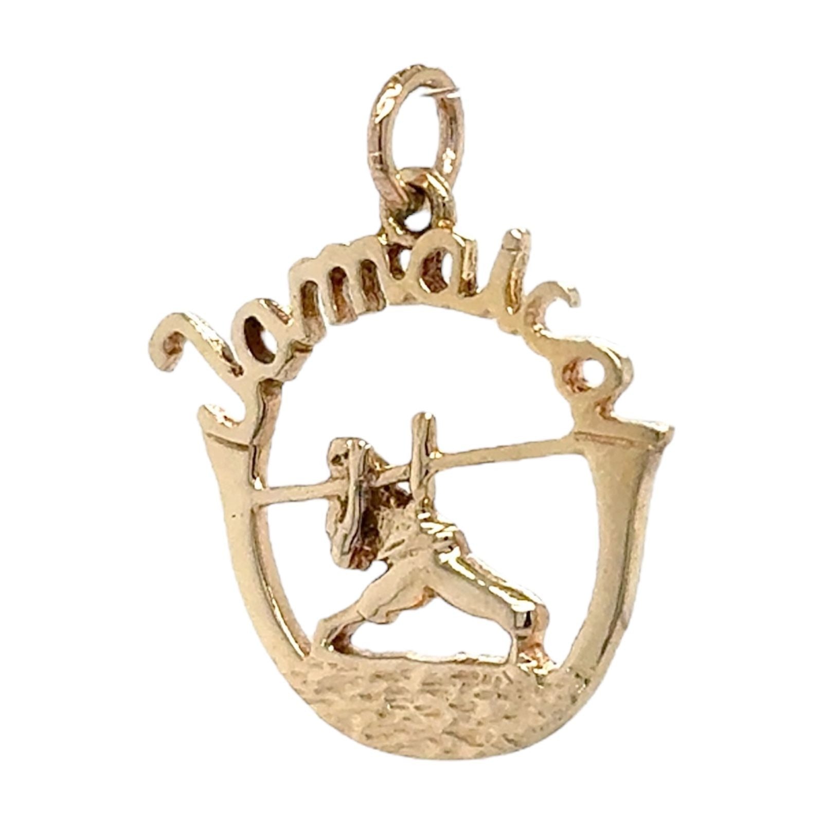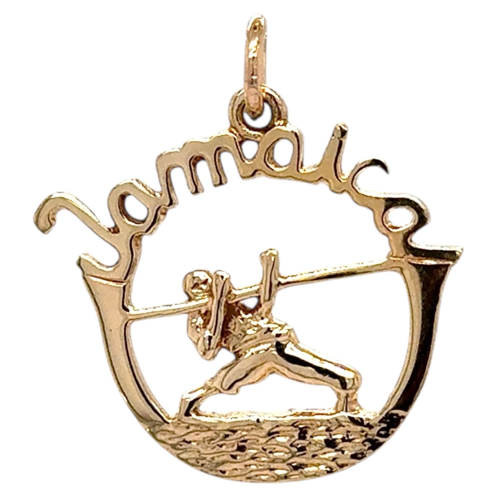Crafted in 14K yellow gold, this Jamaica-themed pendant features a limbo design. Lightweight at 2.1g, it offers a distinctive accessory for jewelry enthusiasts.