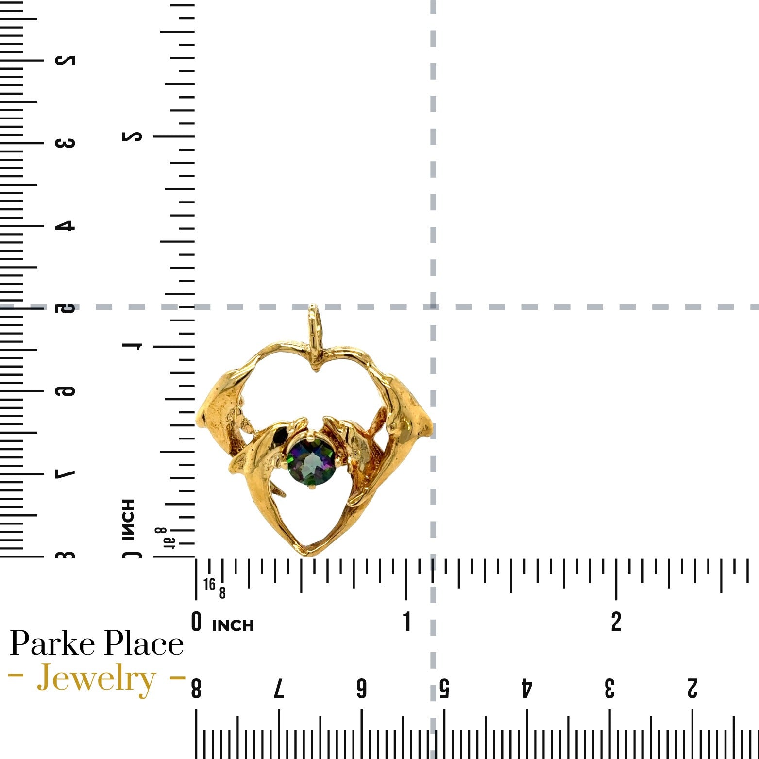 This 14k yellow gold pendant features three dolphins forming a heart, highlighting a vibrant mystic topaz solitaire at its center.