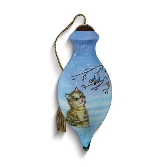 Add a touch of feline charm to your Christmas tree with this beautiful Ne'Qwa Art glass ornament. Featuring a cute cat kitten design in blue, this medium-sized ornament is perfect for any cat lover. The hand-painted details on the glass material make it a unique and exquisite addition to your ornament collection. This collectible ornament is produced in a stylish art glass style and measures 3 inches in length and 2 inches in width. It's a great gift for anyone who loves cats and Christmas. The ornament comes with a set that includes other ornaments, making it a perfect addition to your holiday decor.