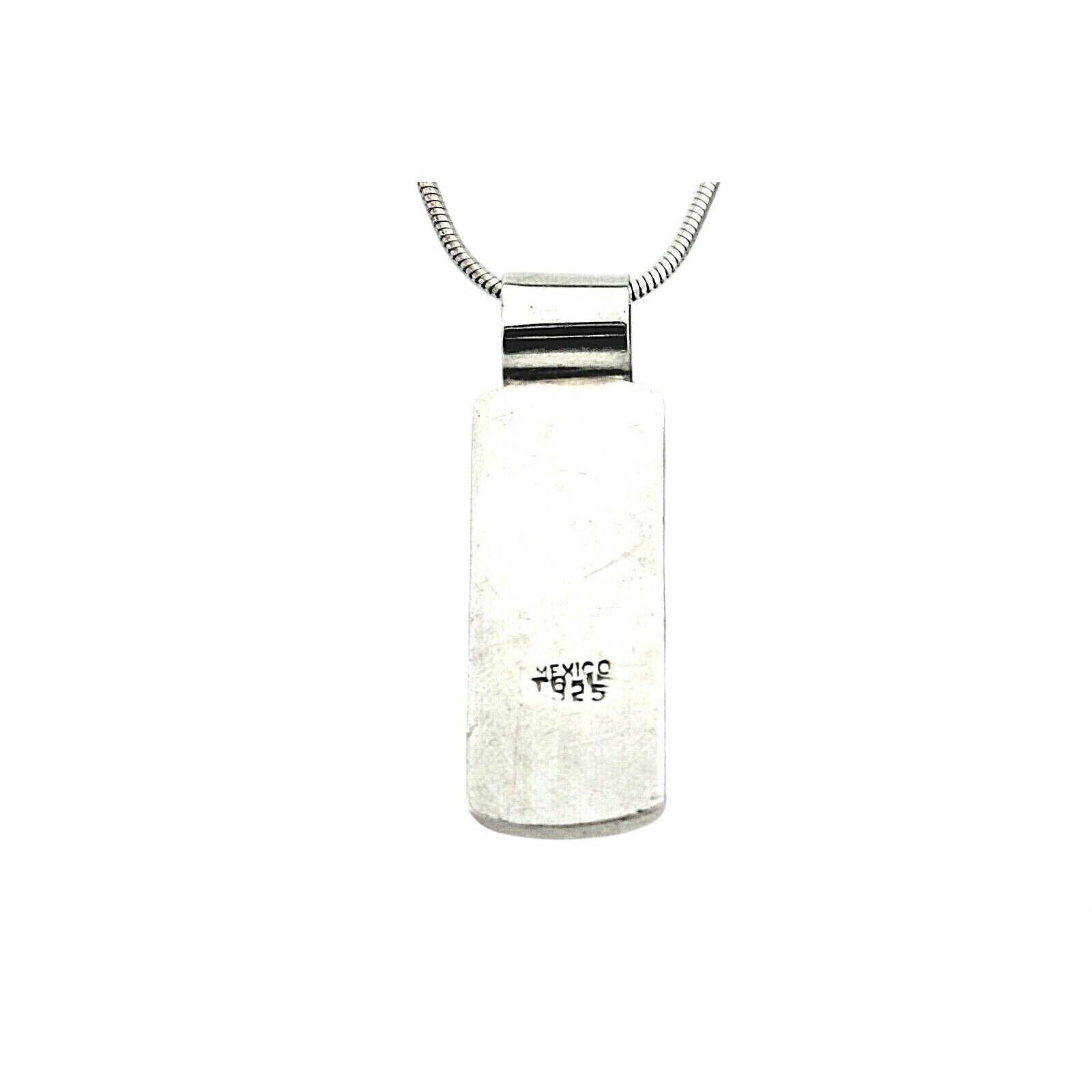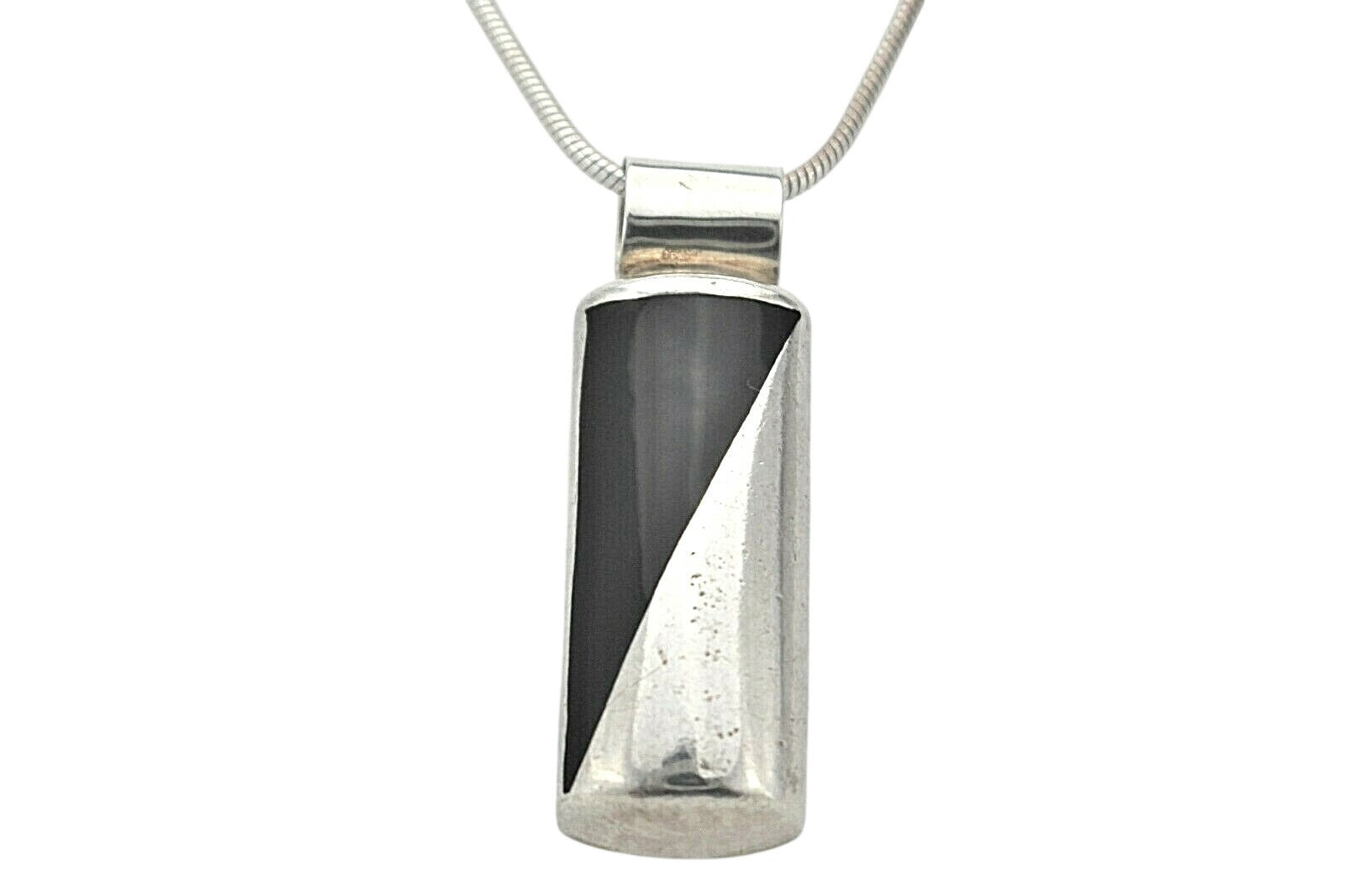 This striking onyx pendant features a sleek, modern design, paired with an 18-inch sterling silver snake chain. Weighs 17.0 grams.