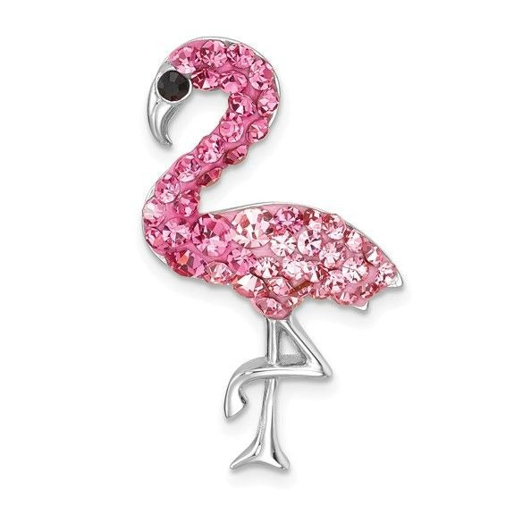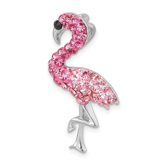 Add a charming and playful touch to your jewelry collection with this sterling silver flamingo pendant featuring sparkling pink crystals and a rhodium finish.