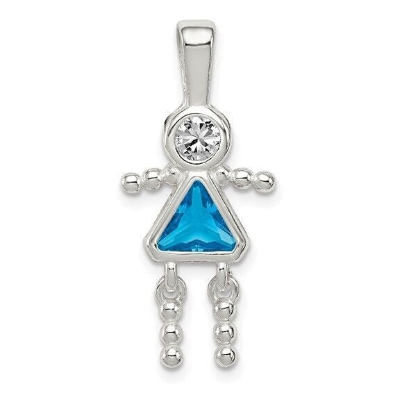 Sterling Silver Rhodium CZ and Birthstone Blue December Glass Girl Pendant