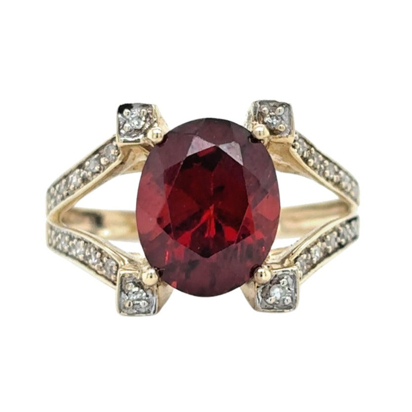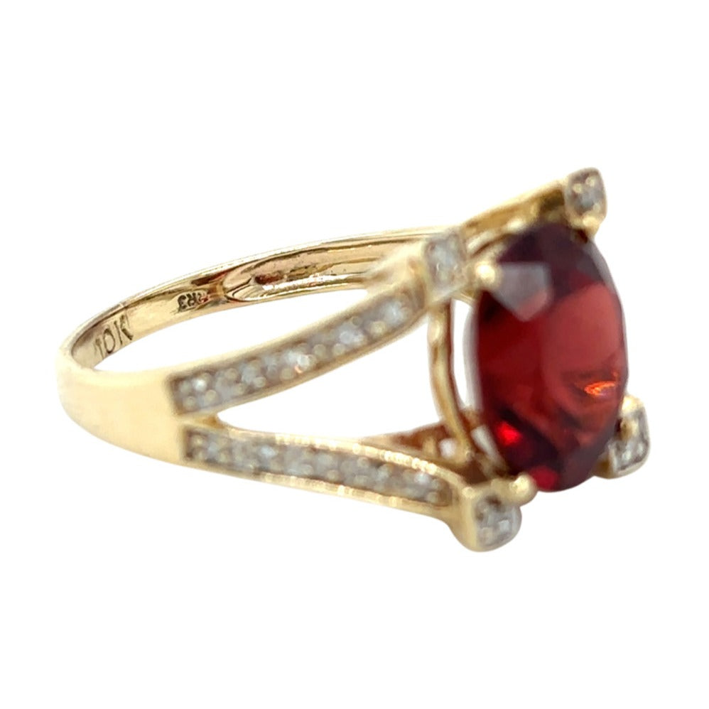 This vintage 10k yellow gold ring features a beautiful garnet stone in an oval shape surrounded by sparkling diamonds. The ring comes in a size 6 and weighs 3.2g. The ring also comes with a seller warranty for your peace of mind when purchasing. Don't miss out on the opportunity to own this beautiful piece!