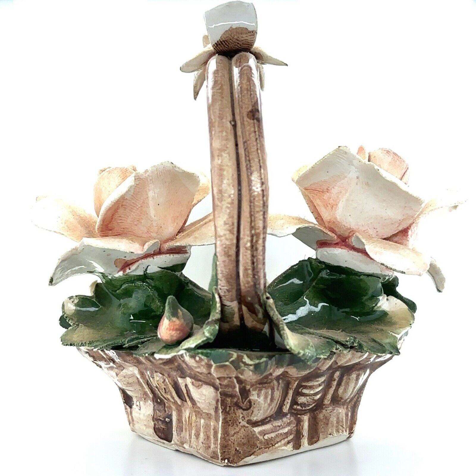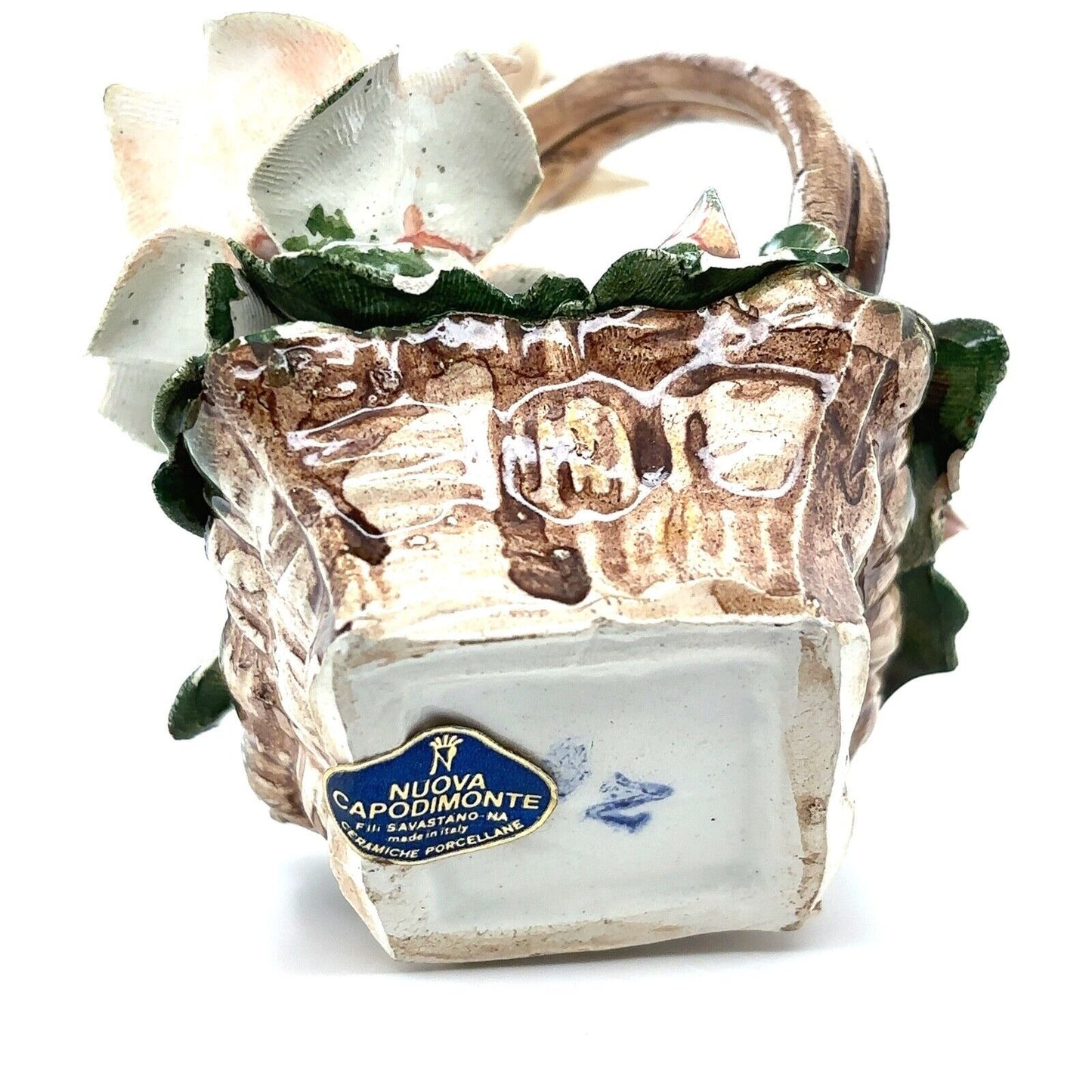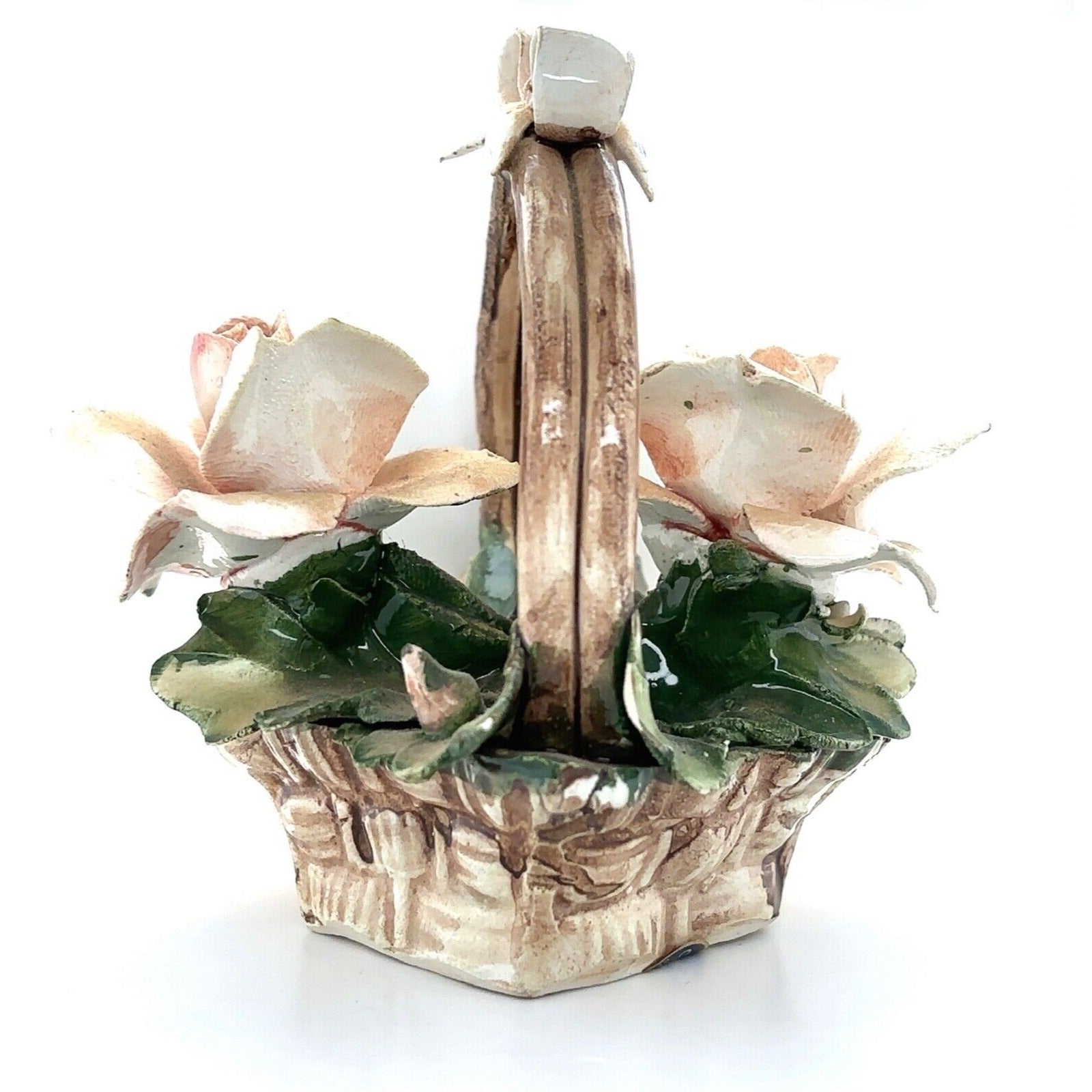 Vintage Capodimonte White Roses Flower Basket Made in Italy 5" Tall