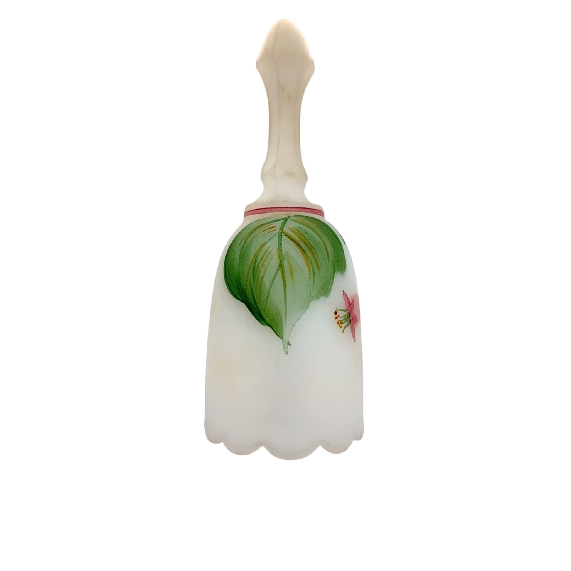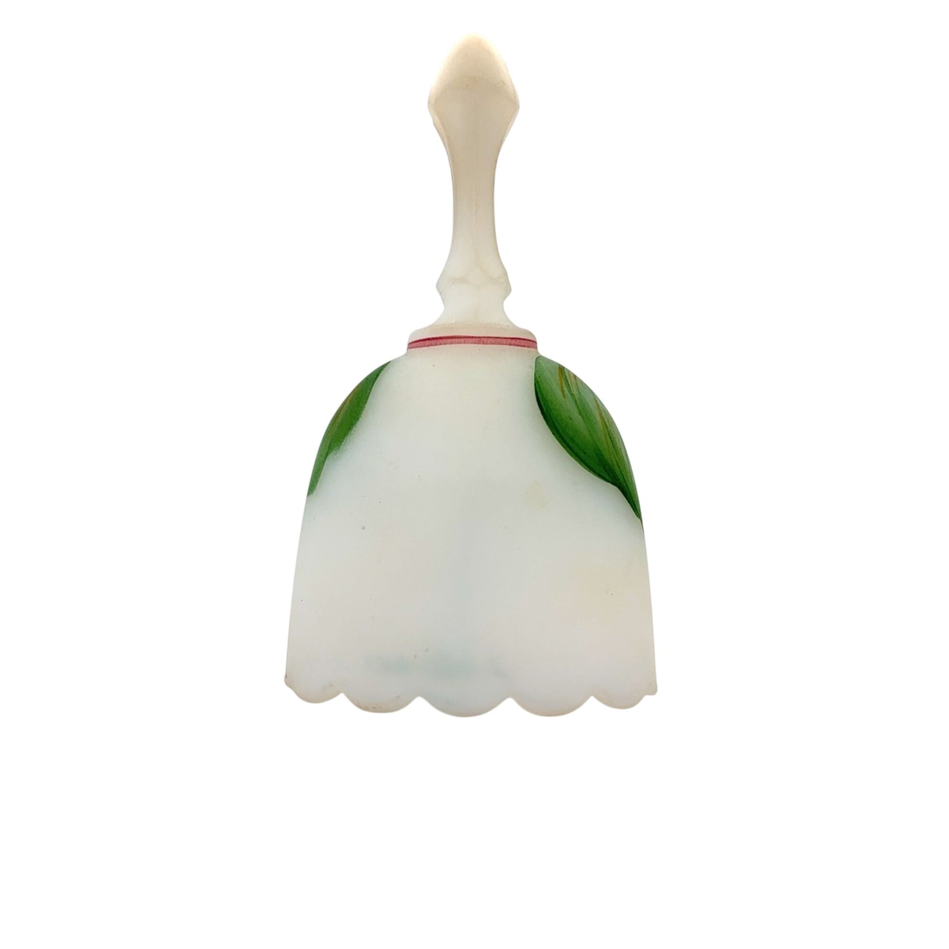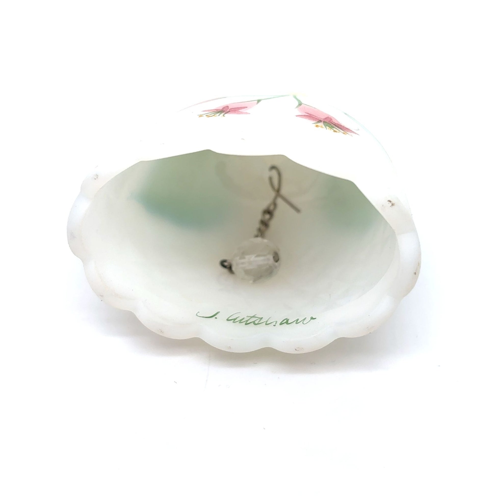 Vintage Fenton Hand-Painted White Satin Bell Floral Design & Scalloped Edge Signed by the Artist. Features a delicate floral design, scalloped edge, and a charming clapper. A timeless collectible or gift.